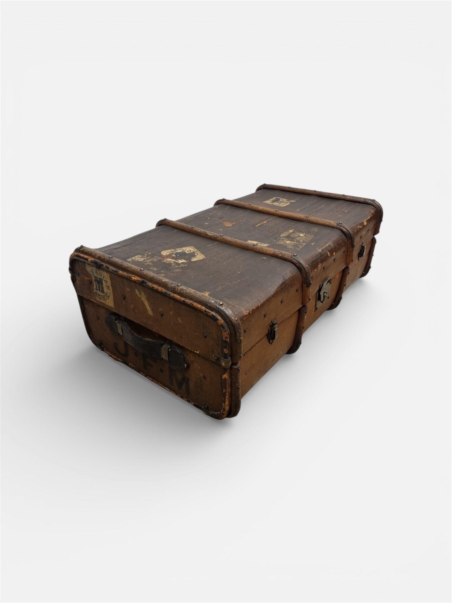 A characterful vintage travel trunk dating from the early 20th century, retaining its original emblems, fittings and straps.