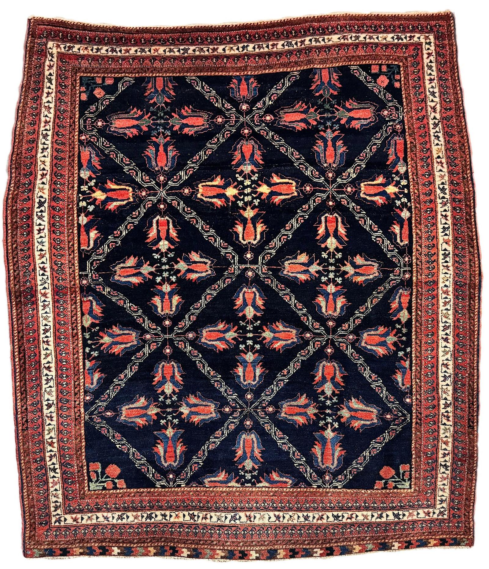 An outstanding antique tribal rug, woven by the Afshar tribe circa 1900, possibly a little earlier. The rug features an allover design of tulips on a deep indigo field. Finely woven with lovely wool quality and stunning colours make this a very decorative rug.
