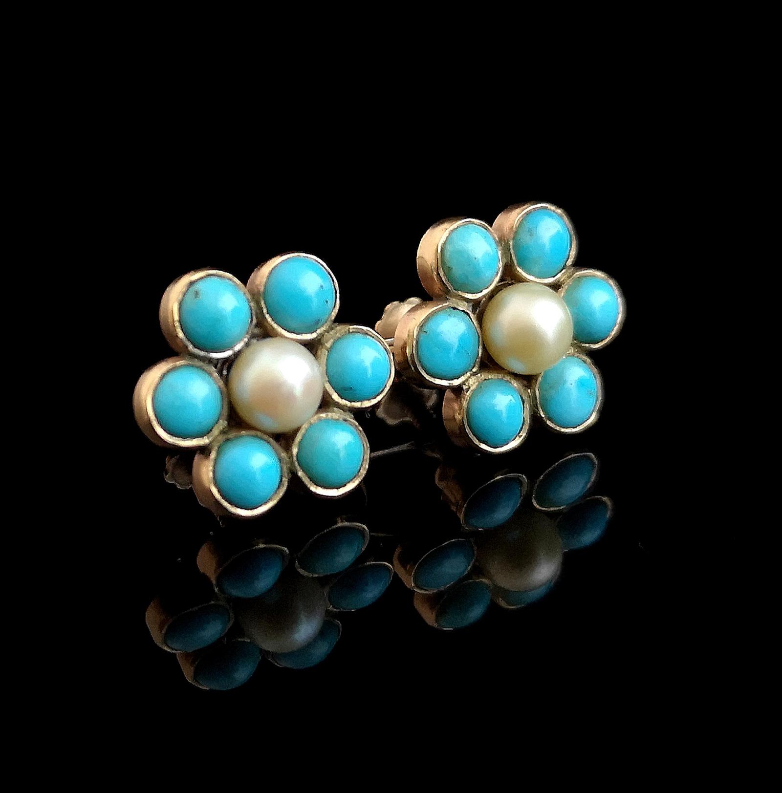Antique Turquoise & Pearl Flower Earrings, 9ct Gold