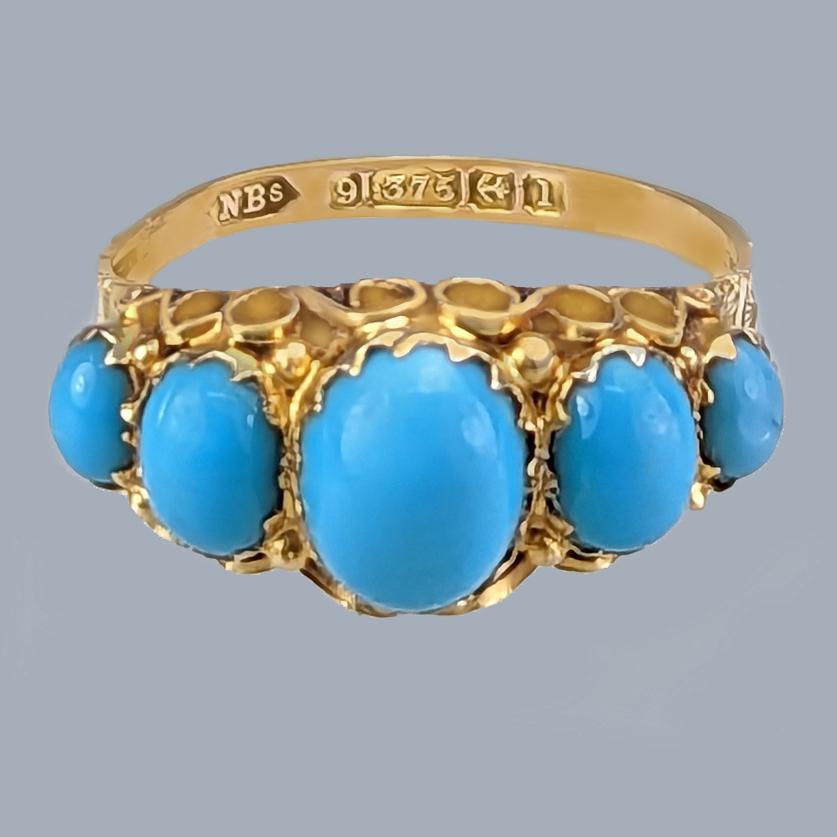Antique Turquoise Ring Hallmarked 1910 Edwardian 9ct Gold Five Stone Ornate Ring