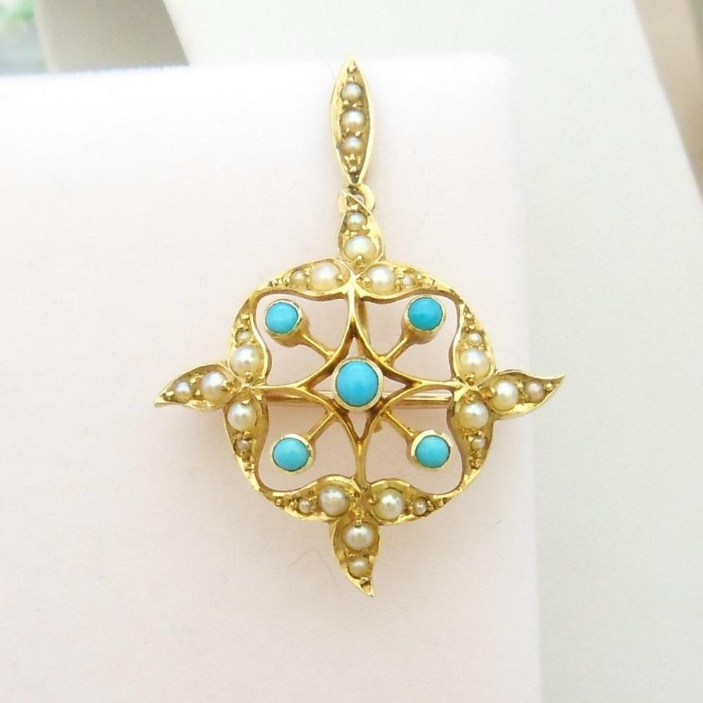 Antique Turquoise & Seed Pearl Set Brooch Pendant 15ct