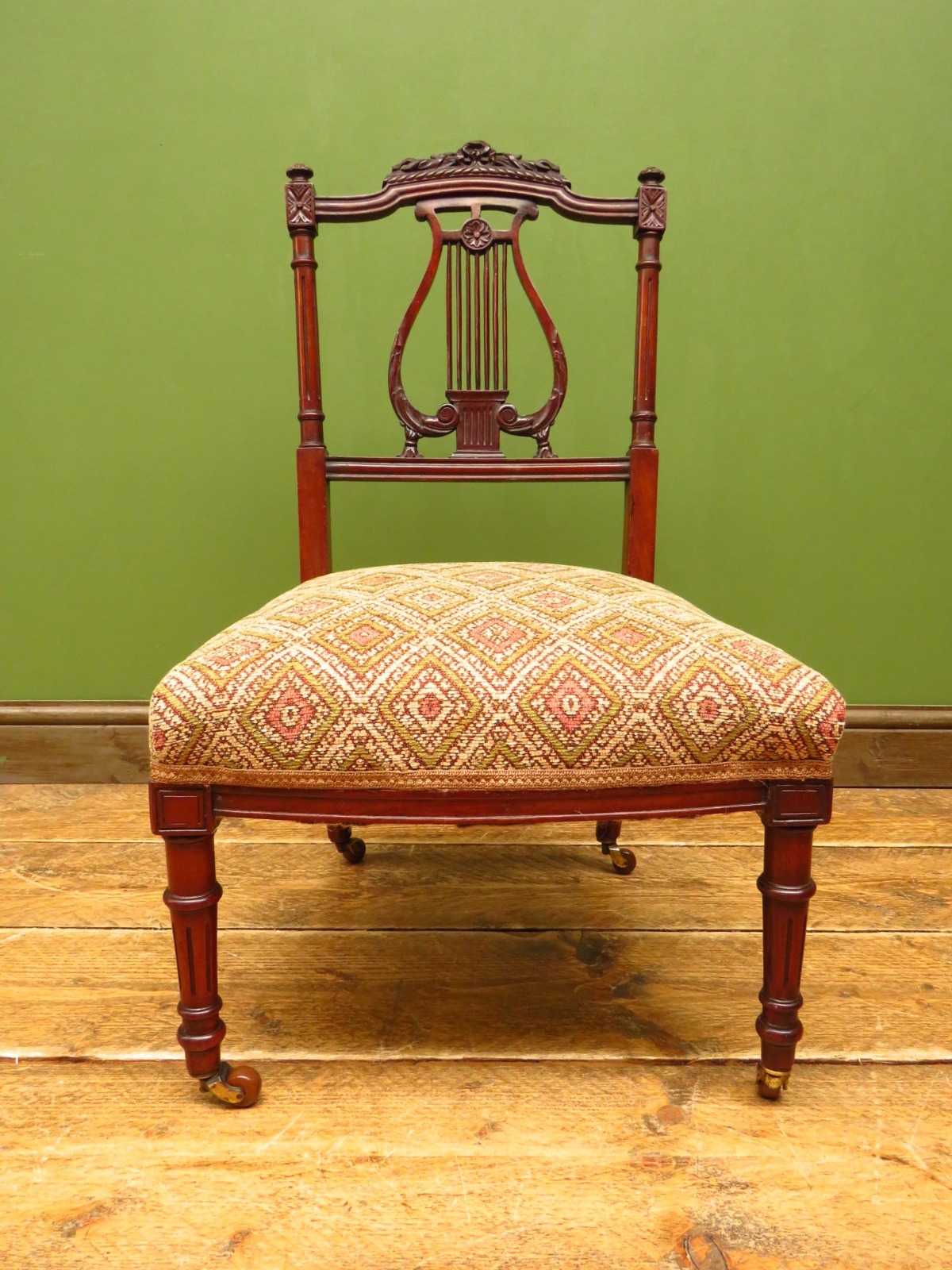 Antique Upholstered Lyre Back Parlour or Nursing Chair with Kilim Fabric