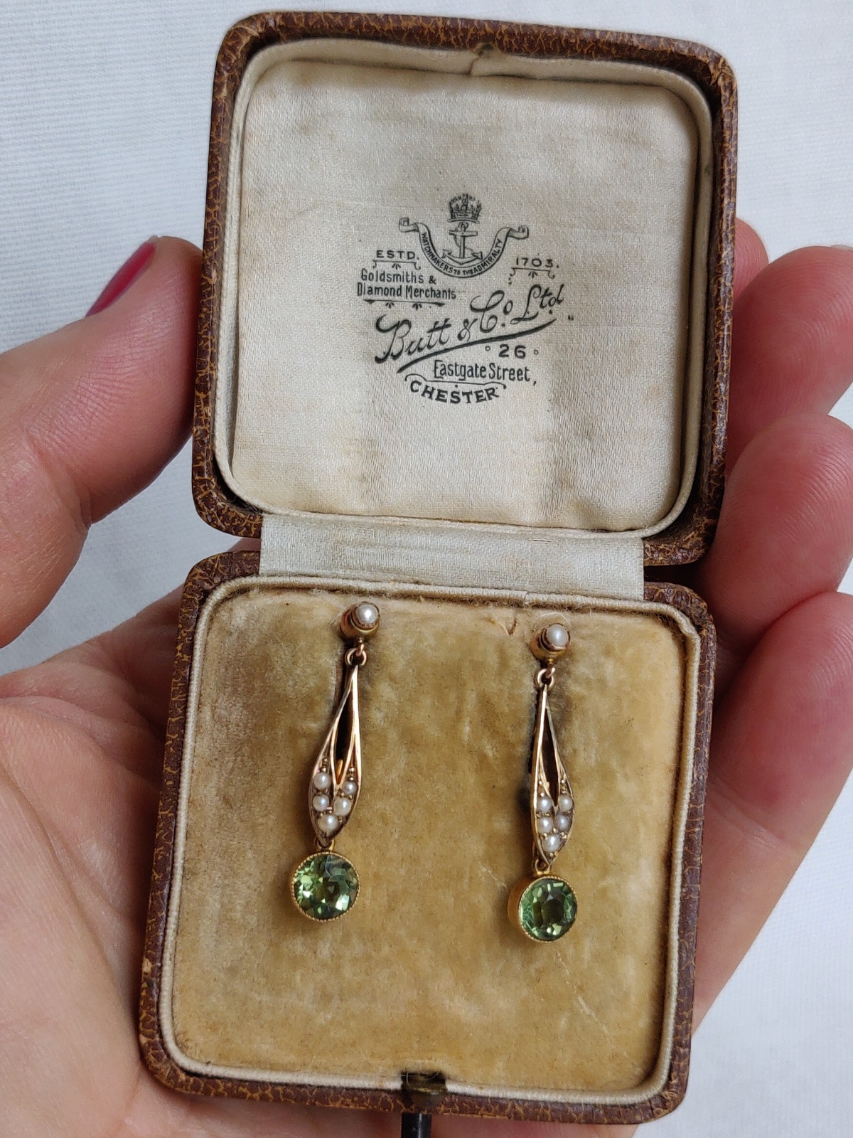 Antique Victorian 14ct Gold Earrings Screw Backs with Natural Peridot Gemstones in Open Back Bezels & Seed Pearls