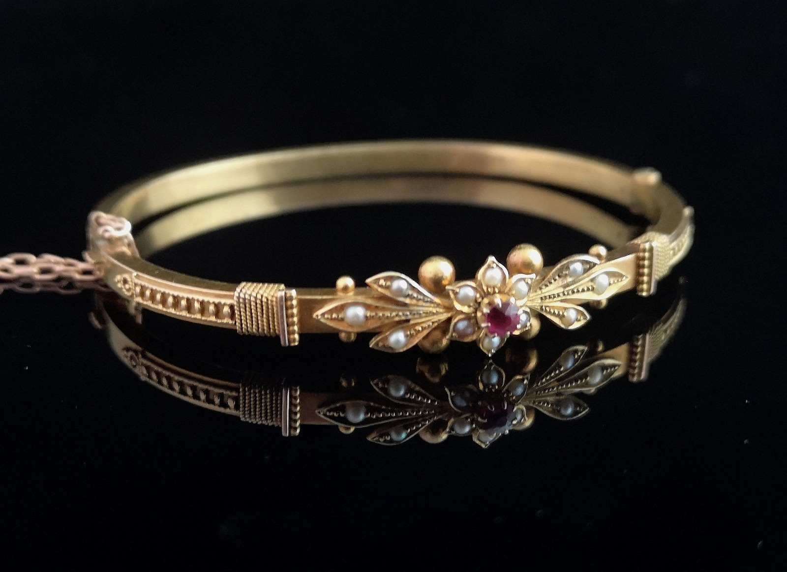 Antique Victorian 15ct Gold Bangle, Ruby & Pearl