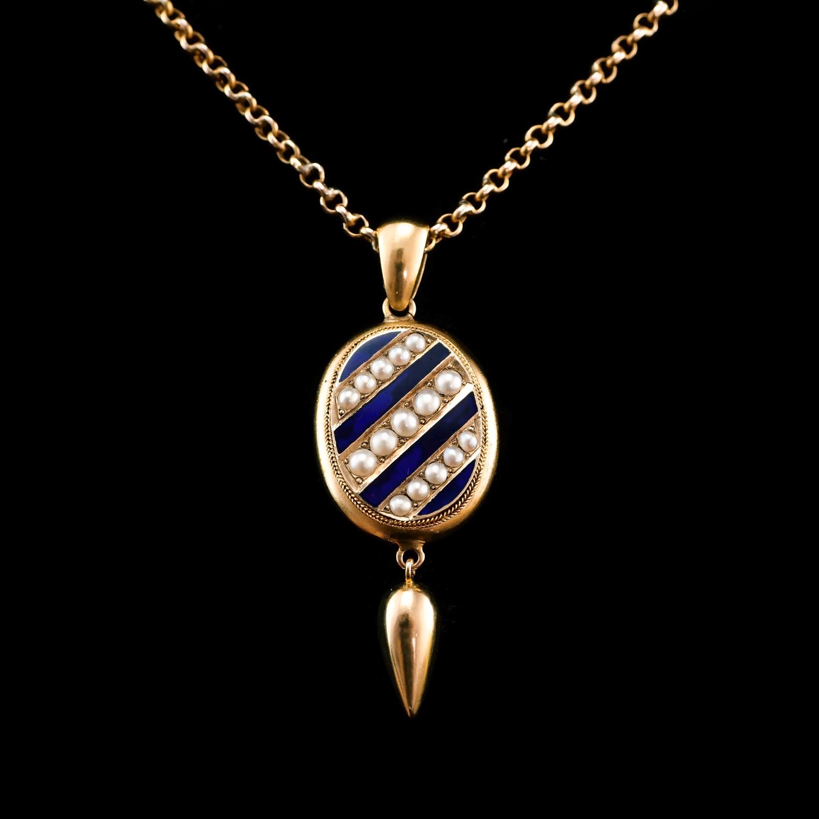Antique Victorian 15ct Gold Blue Enamel & Pearl Pendant Locket - c.1880 (1 of 17)