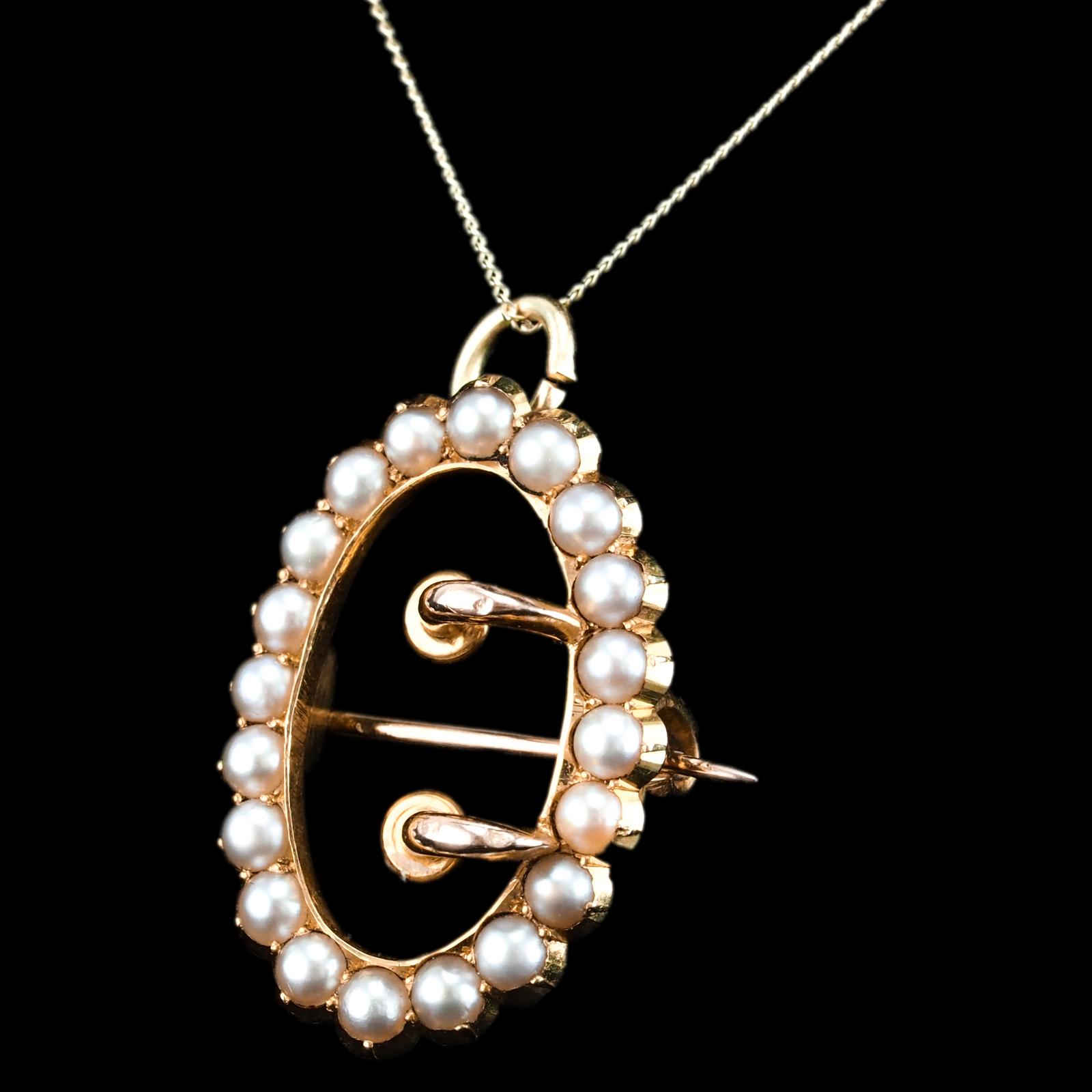 Antique Victorian 15ct Gold Seed Pearl Buckle Pendant Brooch Necklace c.1890