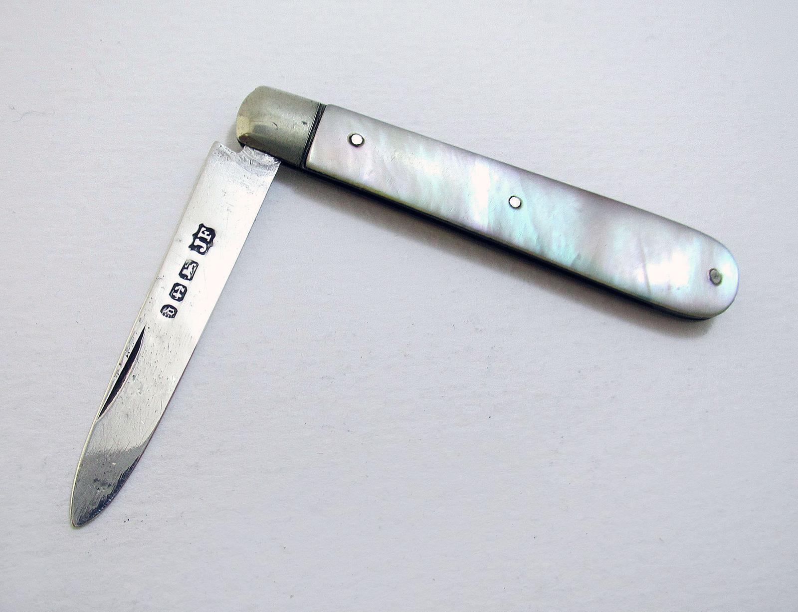 Antique Victorian 1878 Small Solid Sterling Silver Mother of Pearl Mop English Folding Pocket Fruit Penknife
