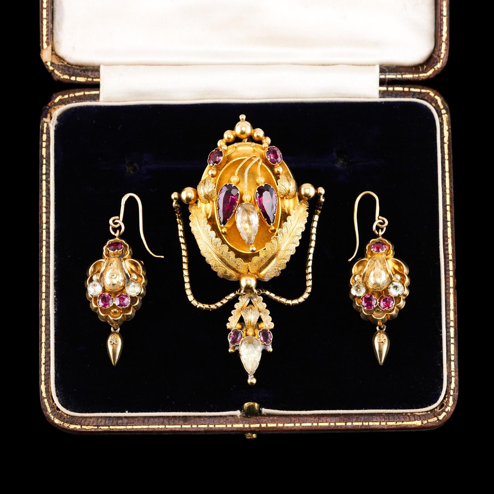 Antique Victorian 18ct Gold Brooch / Pendant & Earrings Garnet & Chrysoberyl - Etruscan Revival c.1870
