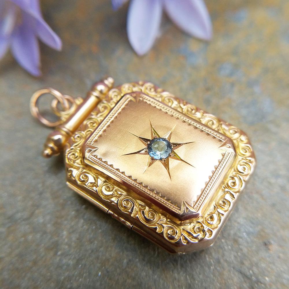 Antique Victorian 9ct Gold & Aquamarine Rectangular Locket Pendant