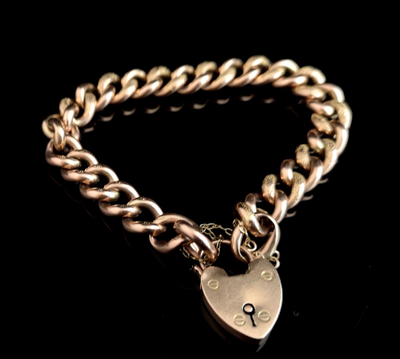 Antique Victorian 9ct Rose Gold Curb Bracelet, Heart Padlock