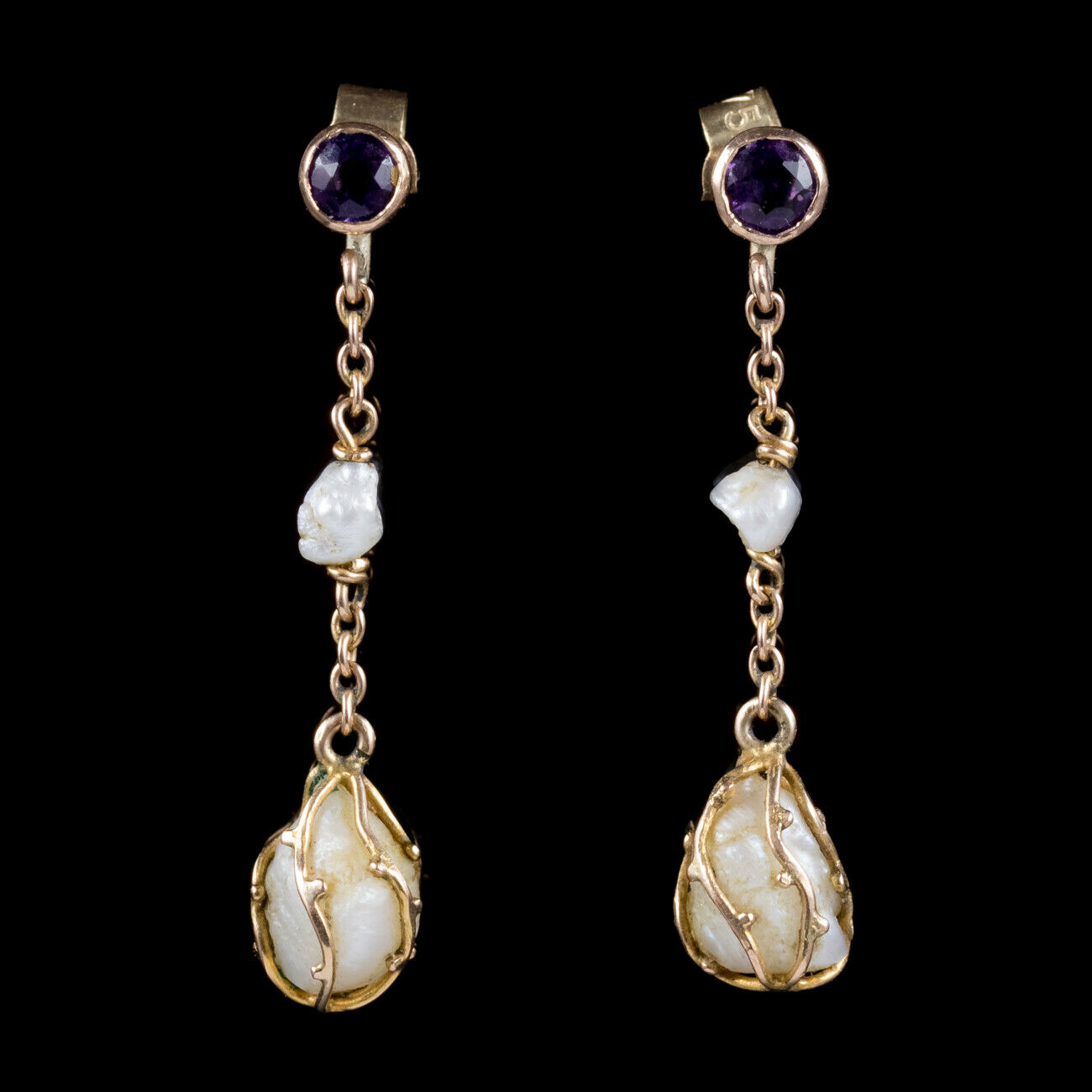 Antique Victorian Amethyst Baroque Pearl Drop Earrings 9ct Gold c.1900