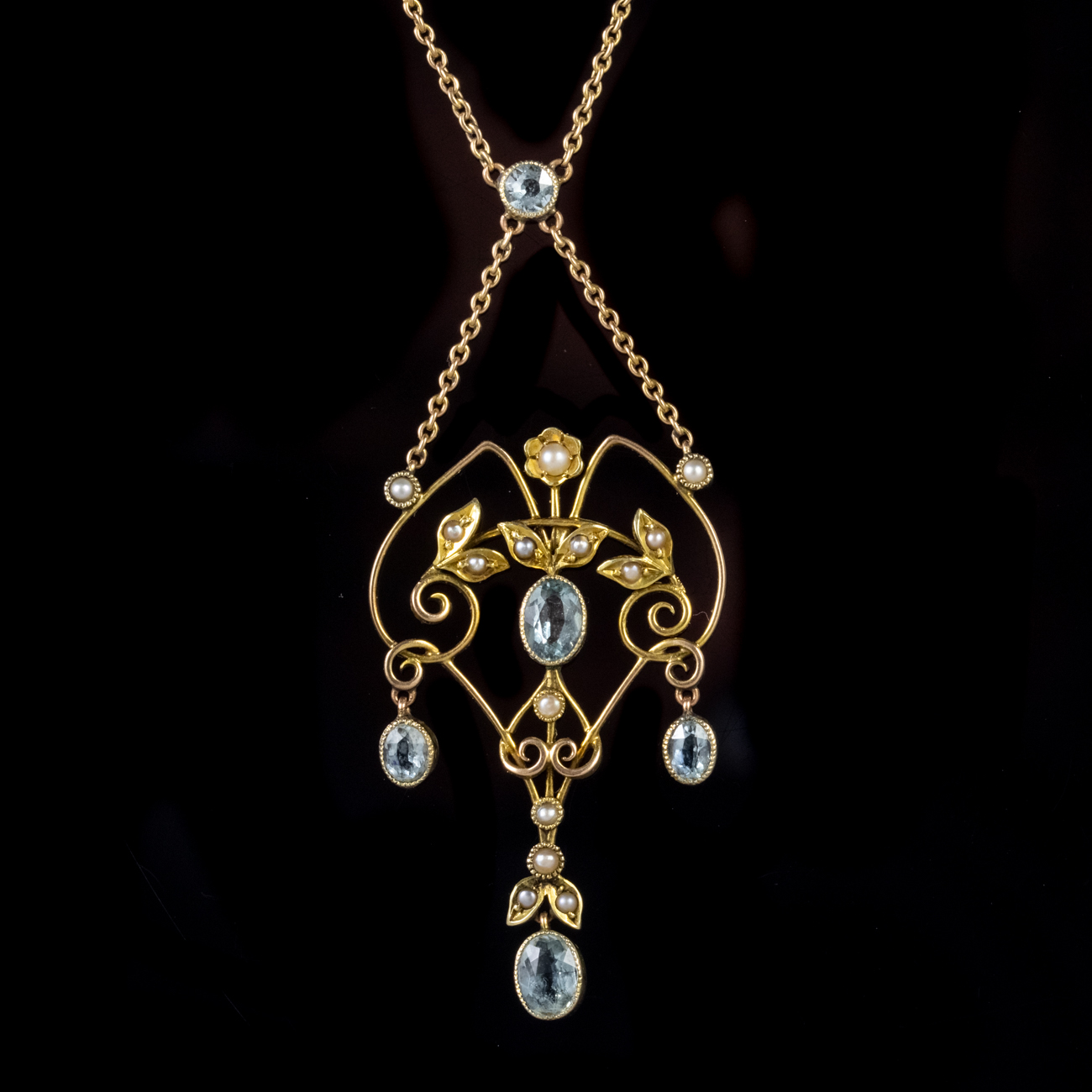 Antique Victorian Aquamarine Pearl Lavaliere Necklace 9ct Gold C.1900