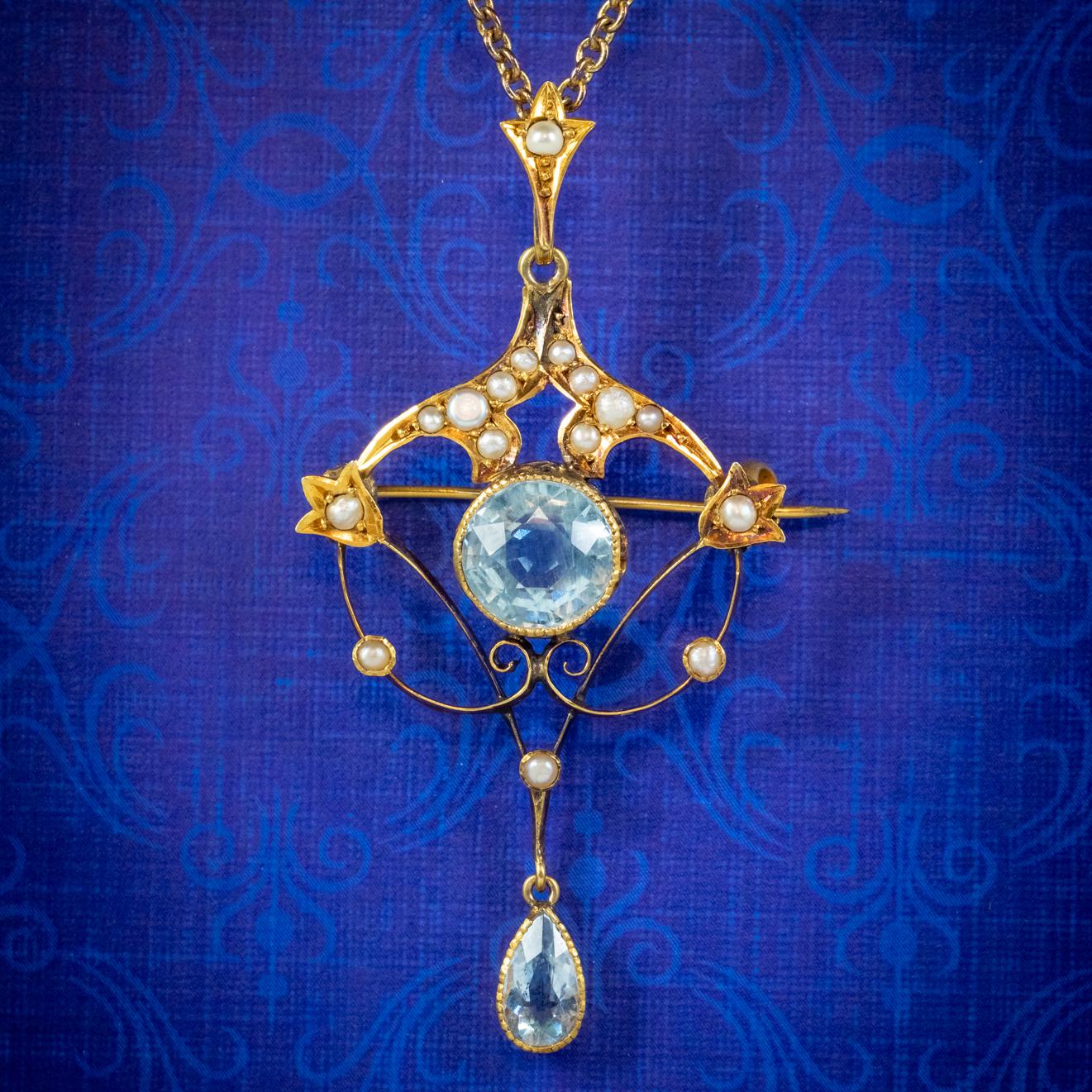 Antique Victorian Art Nouveau Aquamarine Pearl Pendant Necklace 9ct Gold c.1900