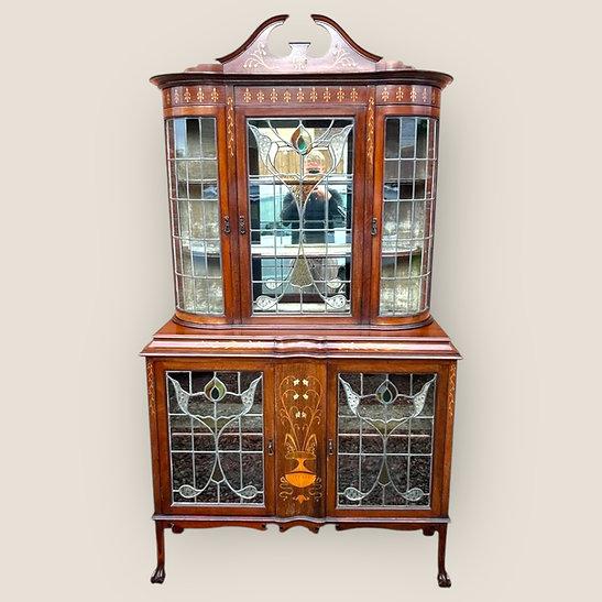 Antique Victorian Art Nouveau Mahogany Inlaid Display Cabinet with Glass Doors