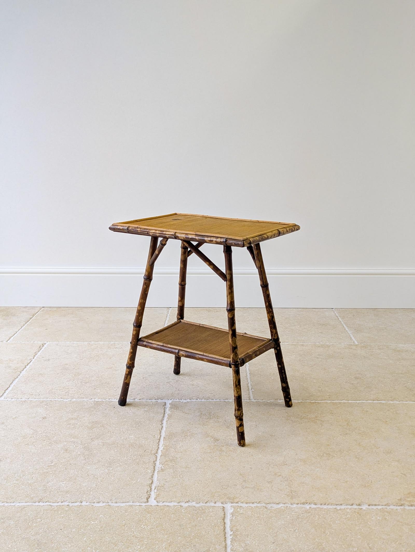 A simple, understated late Victorian bamboo occasional table of rectangular form raised on gently splayed legs united by a lower tier and reinforced with typical decorative cross braces below the tabletop. Wonderfully original with excellent colour, showcasing the fashionable Aesthetic Movement’s Anglo-Japanese influence of the period.