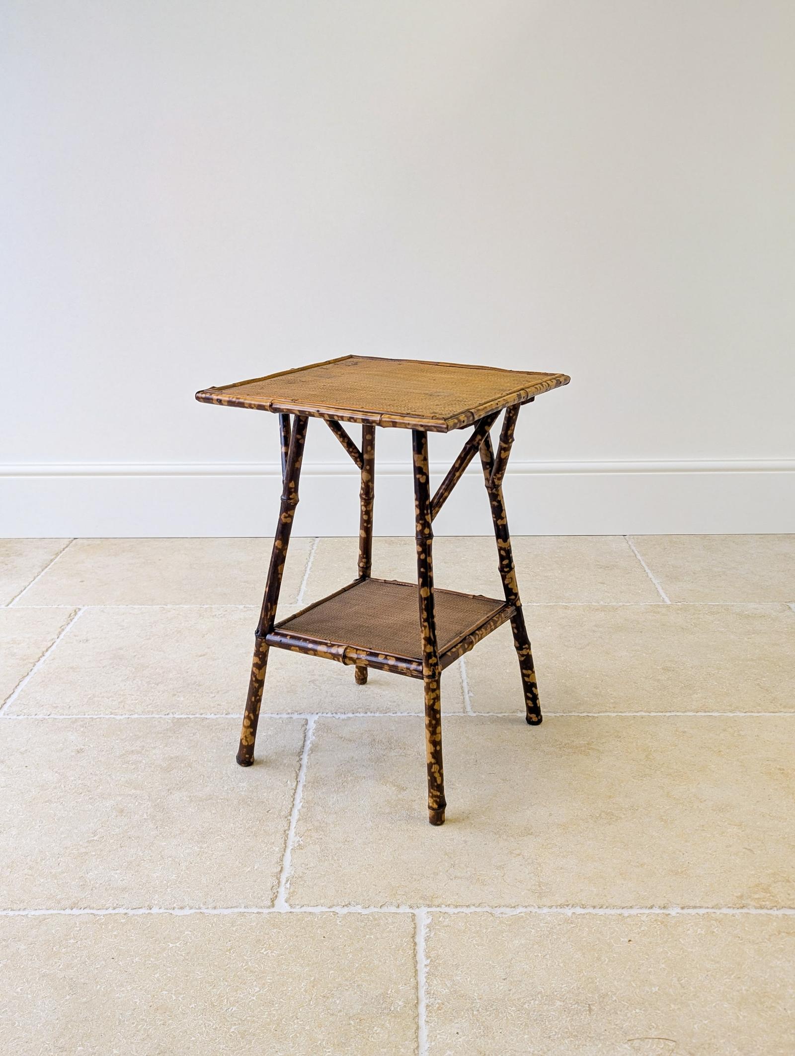 A late Victorian bamboo occasional table of square form, raised on gently splayed legs united by a lower tier and reinforced with typical decorative braces below the tabletop. A good original example with a warm, natural colour and reflecting the Anglo-Japanese influence that shaped the Aesthetic Movement in the closing years of the 19th century.