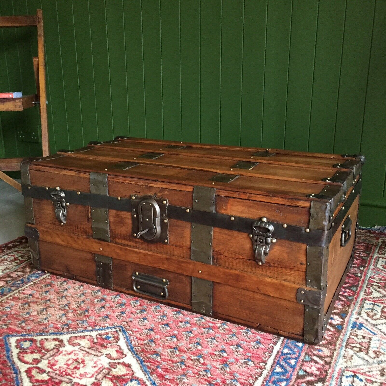 Antique Victorian Banded Steamer Trunk Coffee Table Old Rustic Pine Travel Storage Chest + Key