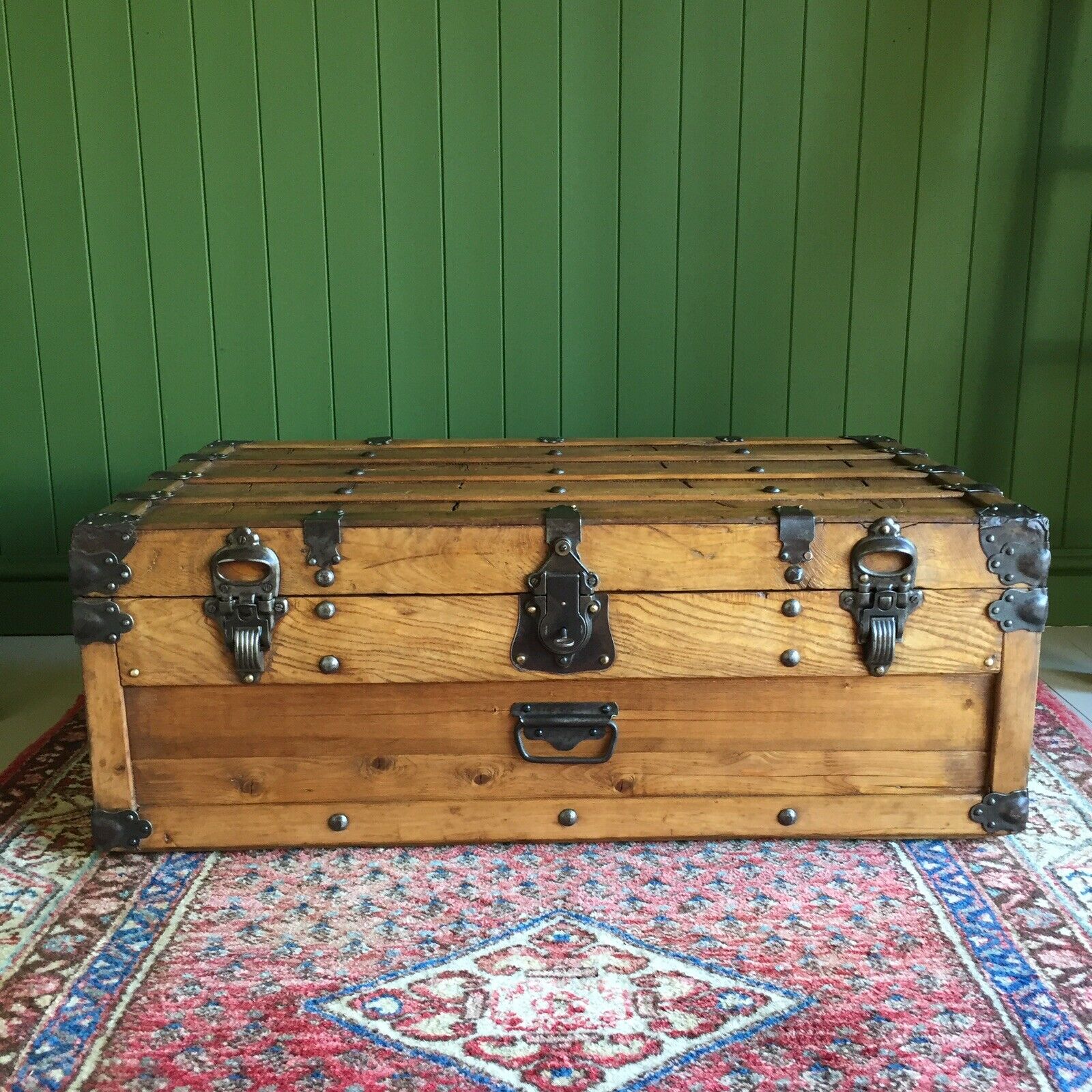 Antique Victorian Banded Steamer Trunk Coffee Table Old Rustic Pine Travel Storage Chest + Key