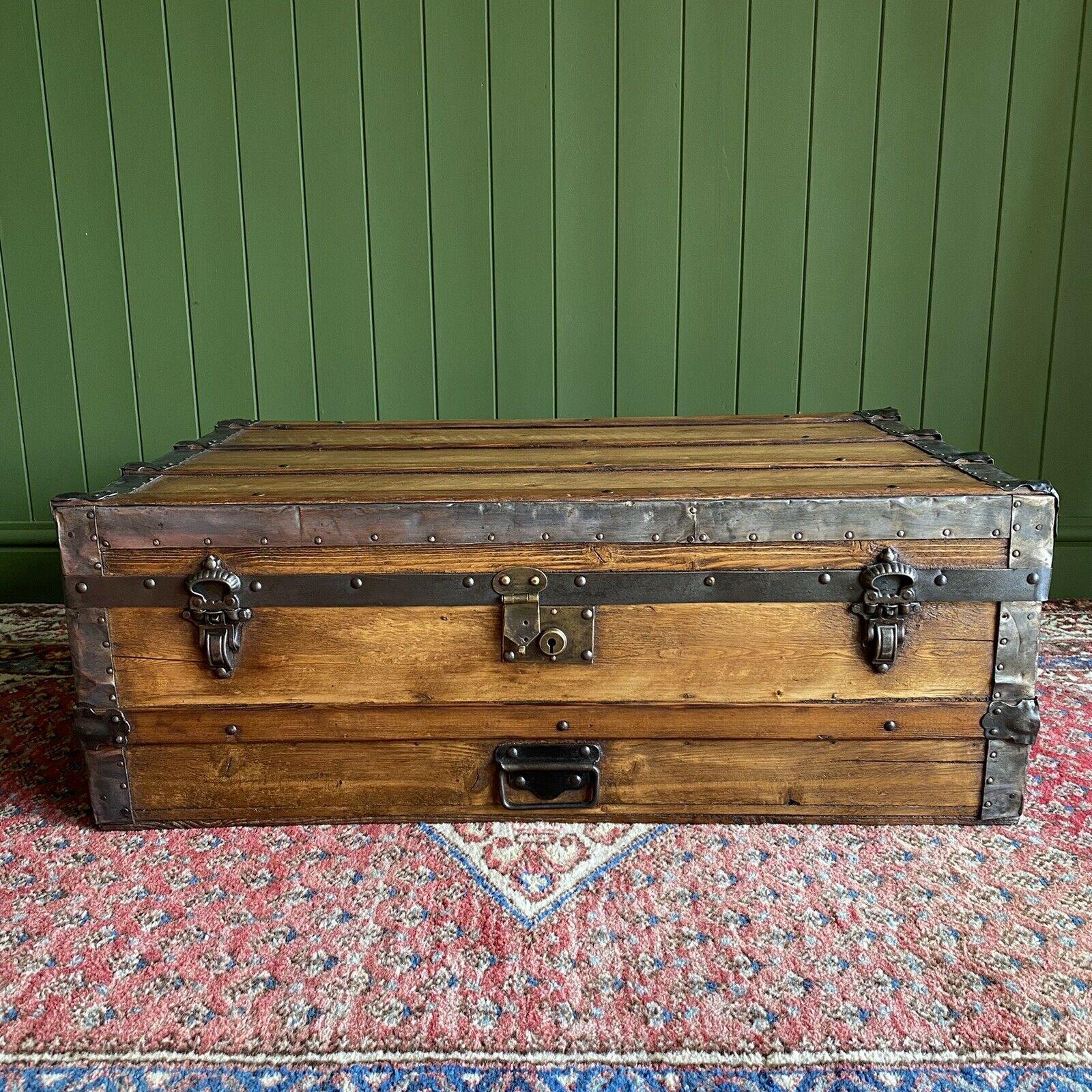 Antique Victorian Banded Steamer Trunk Old Rustic Pine Chest Wooden Blanket Storage Box