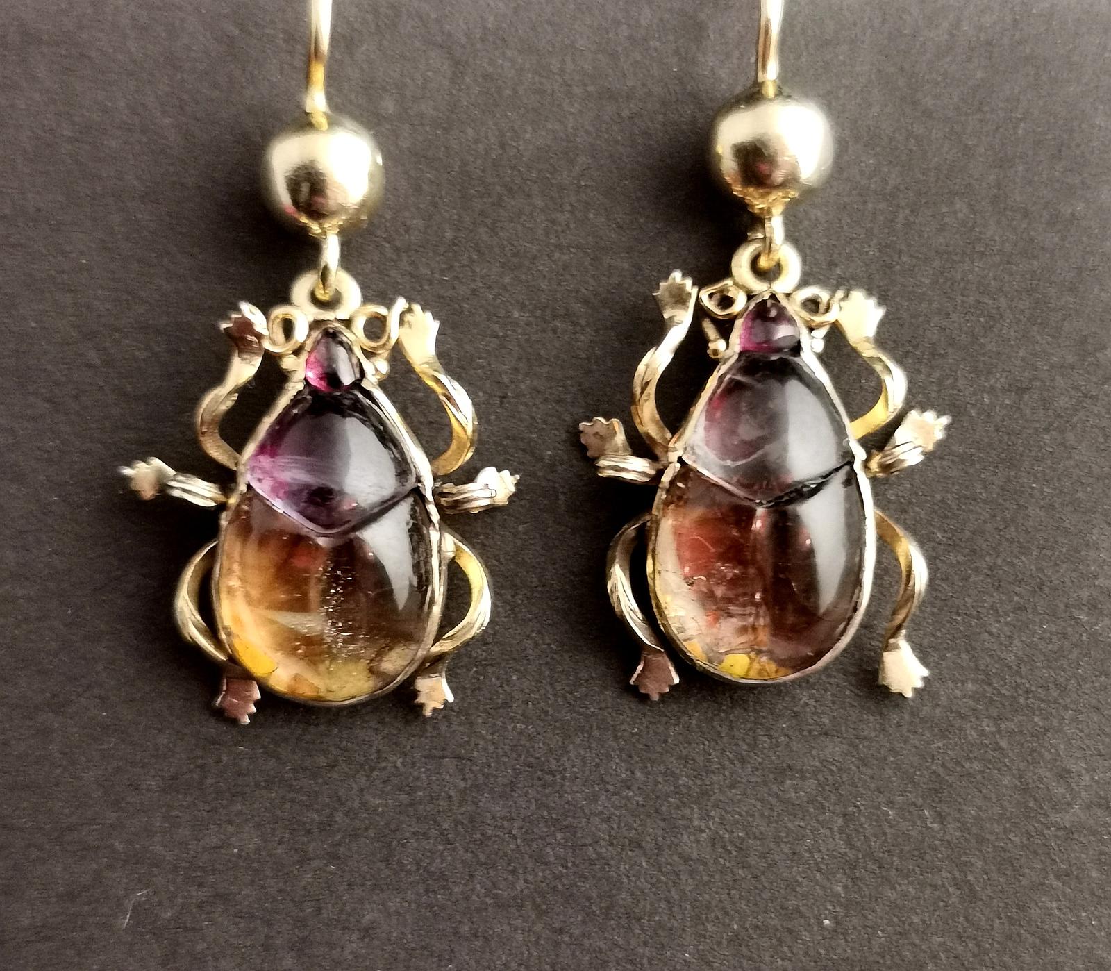 Antique Victorian Beetle Earrings, 9ct Gold, Egyptian Revival