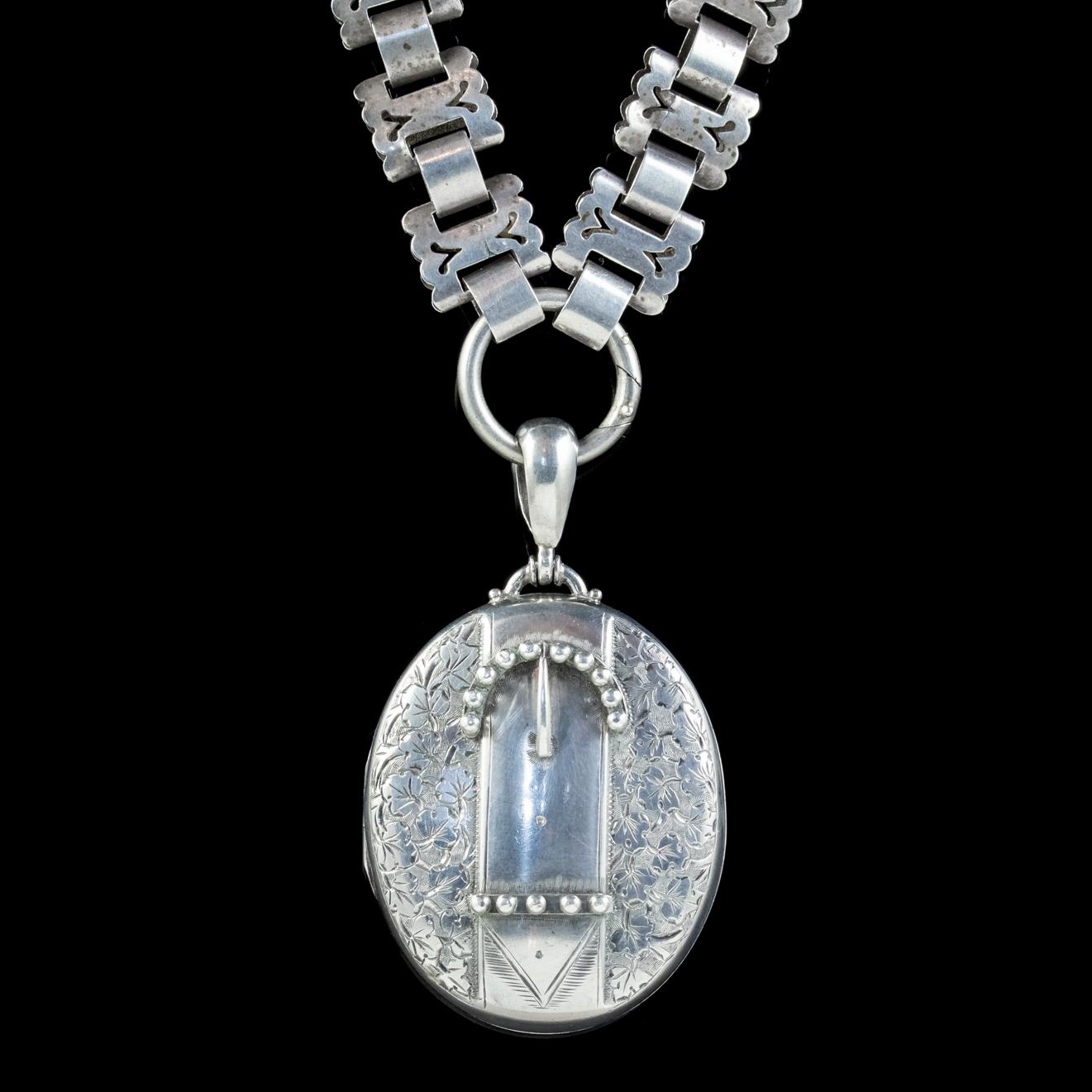 Antique Victorian Buckle Locket & Collar Necklace Sterling Silver c.1880