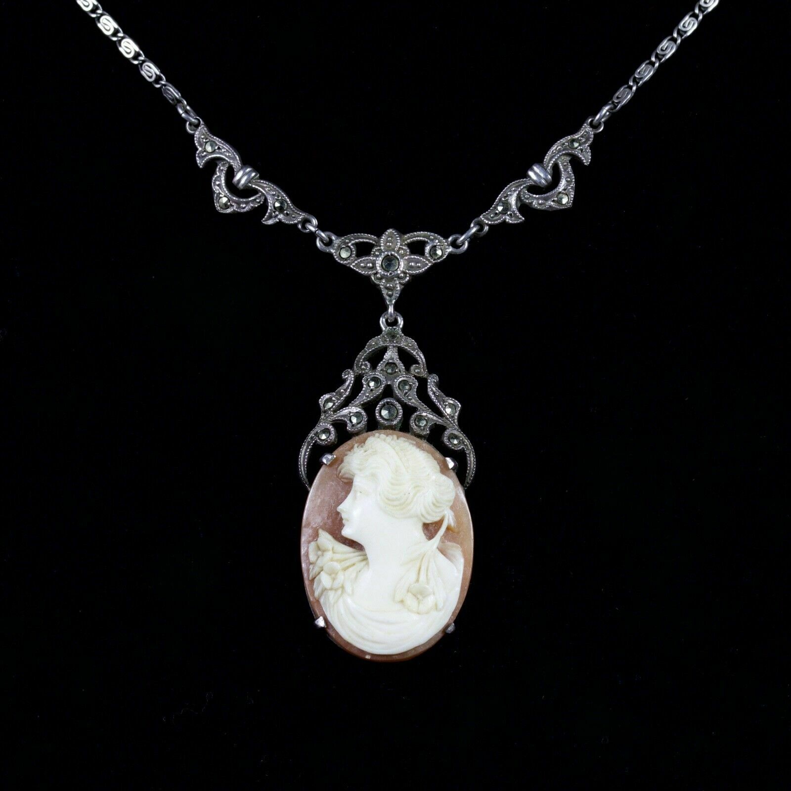Antique Victorian Cameo Marcasite Necklace Sterling Silver c.1900