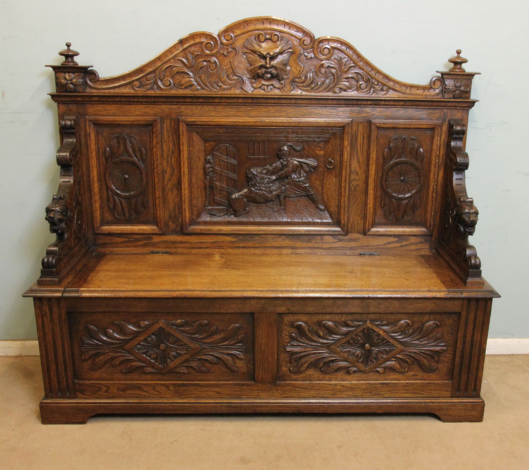 Antique Victorian Carved Oak Green Man Settle / Hall Seat / Monks Bench (1 of 1)