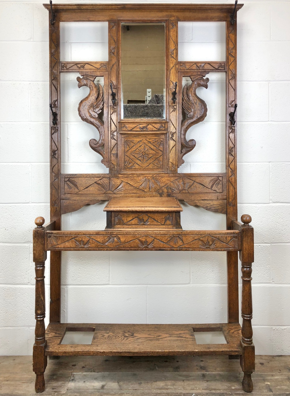 Antique Victorian Carved Oak Hat & Coat Hall Stand