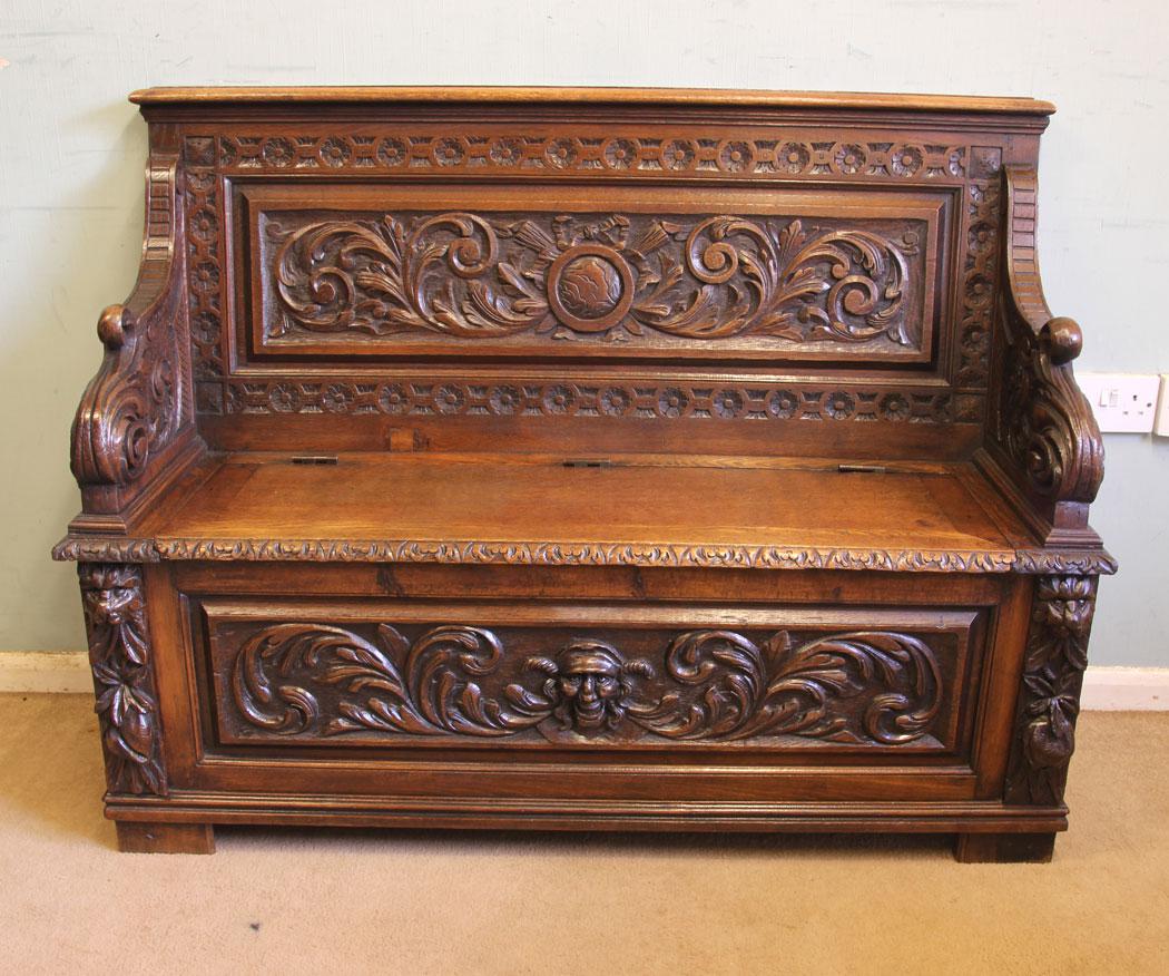 Antique Victorian Carved Oak Settle Bench Hall Seat