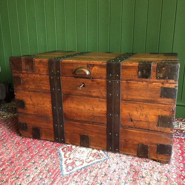 Antique Victorian Colonial Military Chest Old Rustic Pine Wooden Storage Trunk Zinc Lining + Key