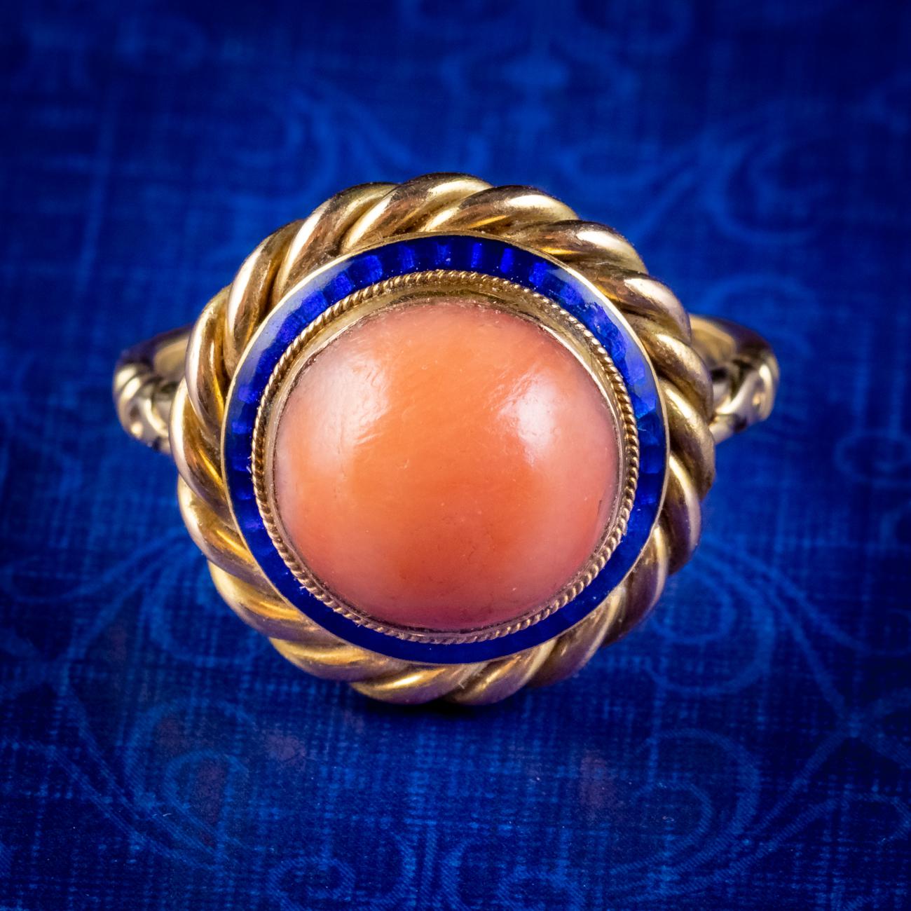 Antique Victorian Coral Enamel Ring 15ct Gold Circa 1900