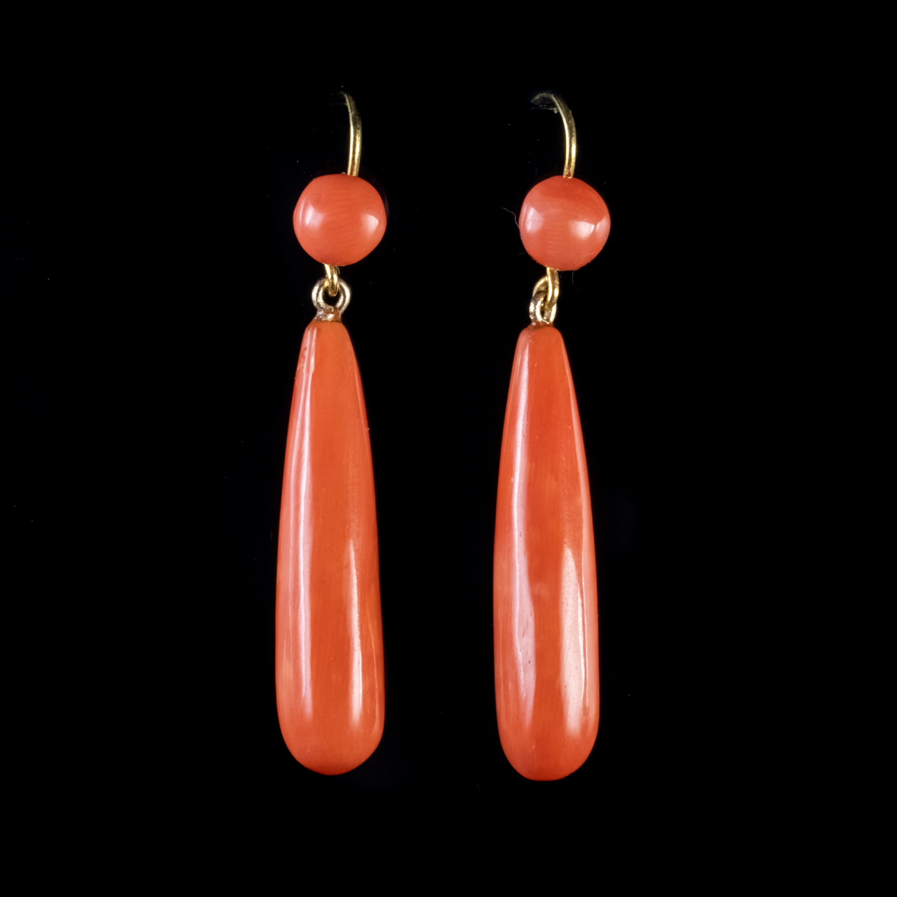 Antique Victorian Coral Long Drop Earrings 9ct Gold c.1880