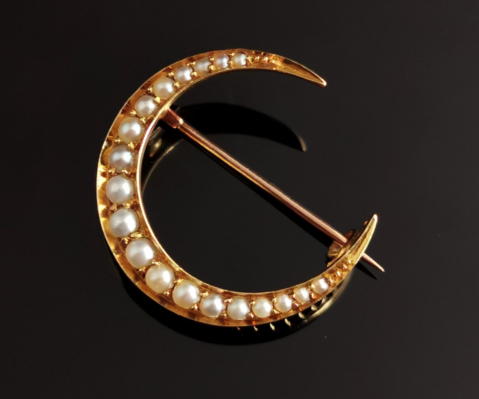 Antique Victorian Crescent Moon Brooch, 15ct Gold & Pearl