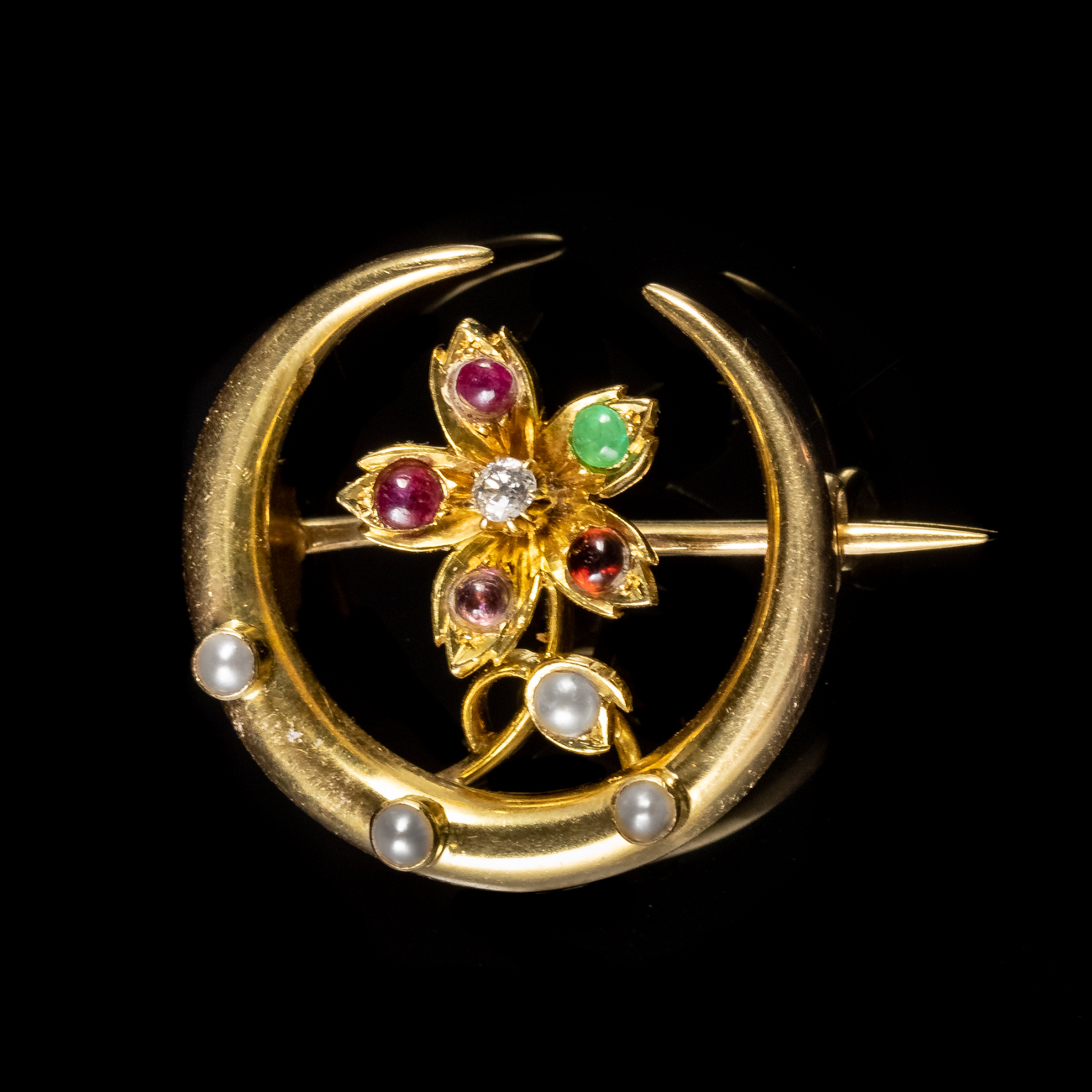 Antique Victorian Crescent Moon Regard Brooch 18ct Gold circa 1900