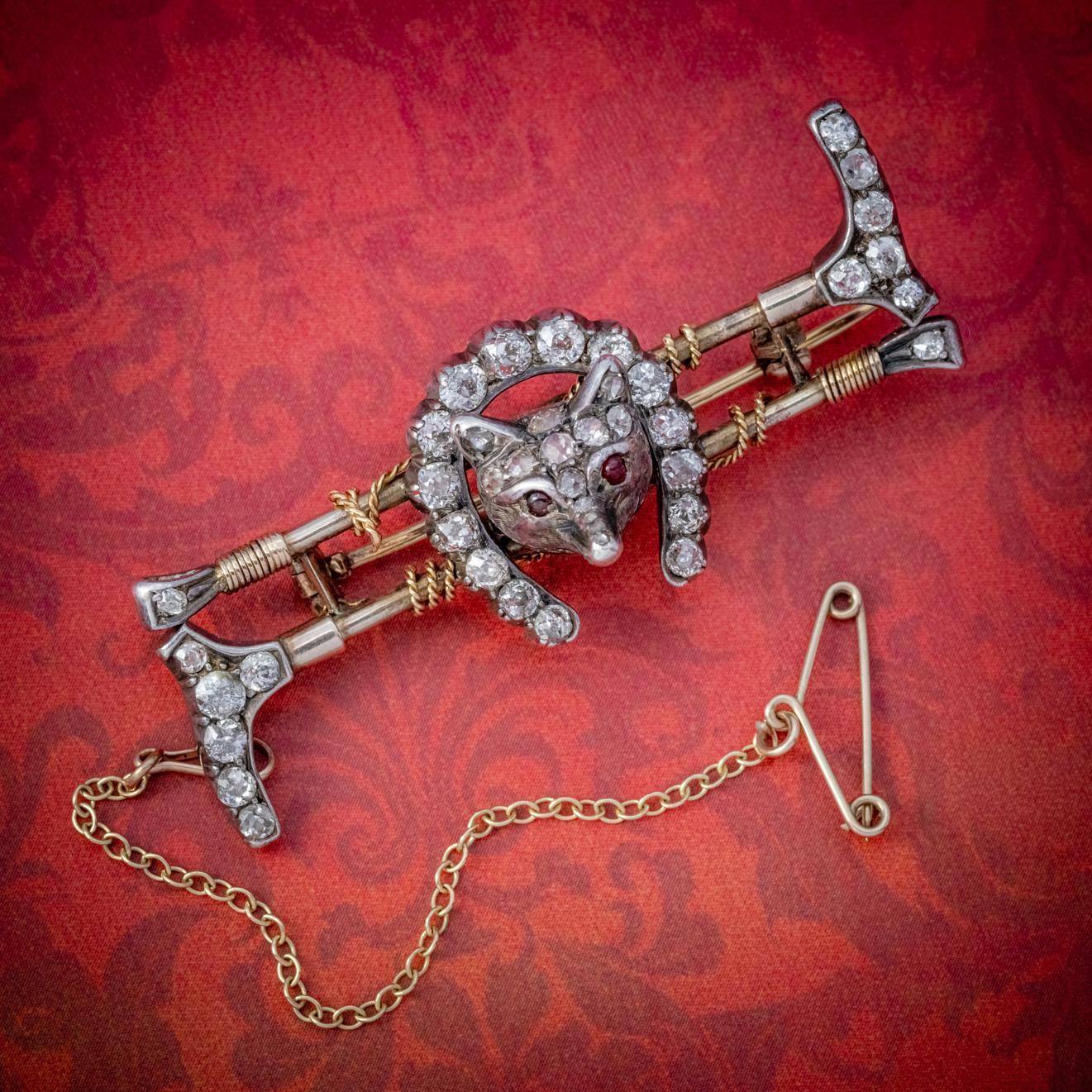 Antique Victorian Diamond Fox Hunting Riding Brooch Silver 18ct Gold 2ct of Diamond c.1900