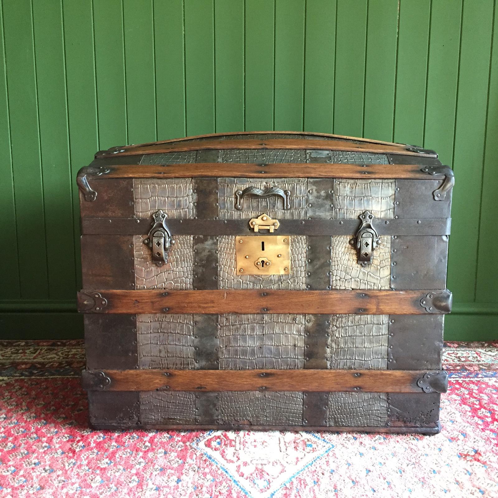 Antique Victorian Dome Top Steamer Trunk Old Gothic Travel Chest Metal Storage Box Steampunk Style