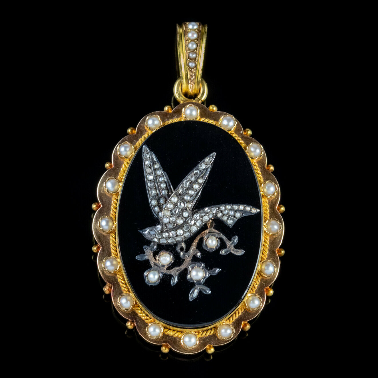 Antique Victorian Dove Locket Onyx Diamond Pearl 18ct Gold c.1880