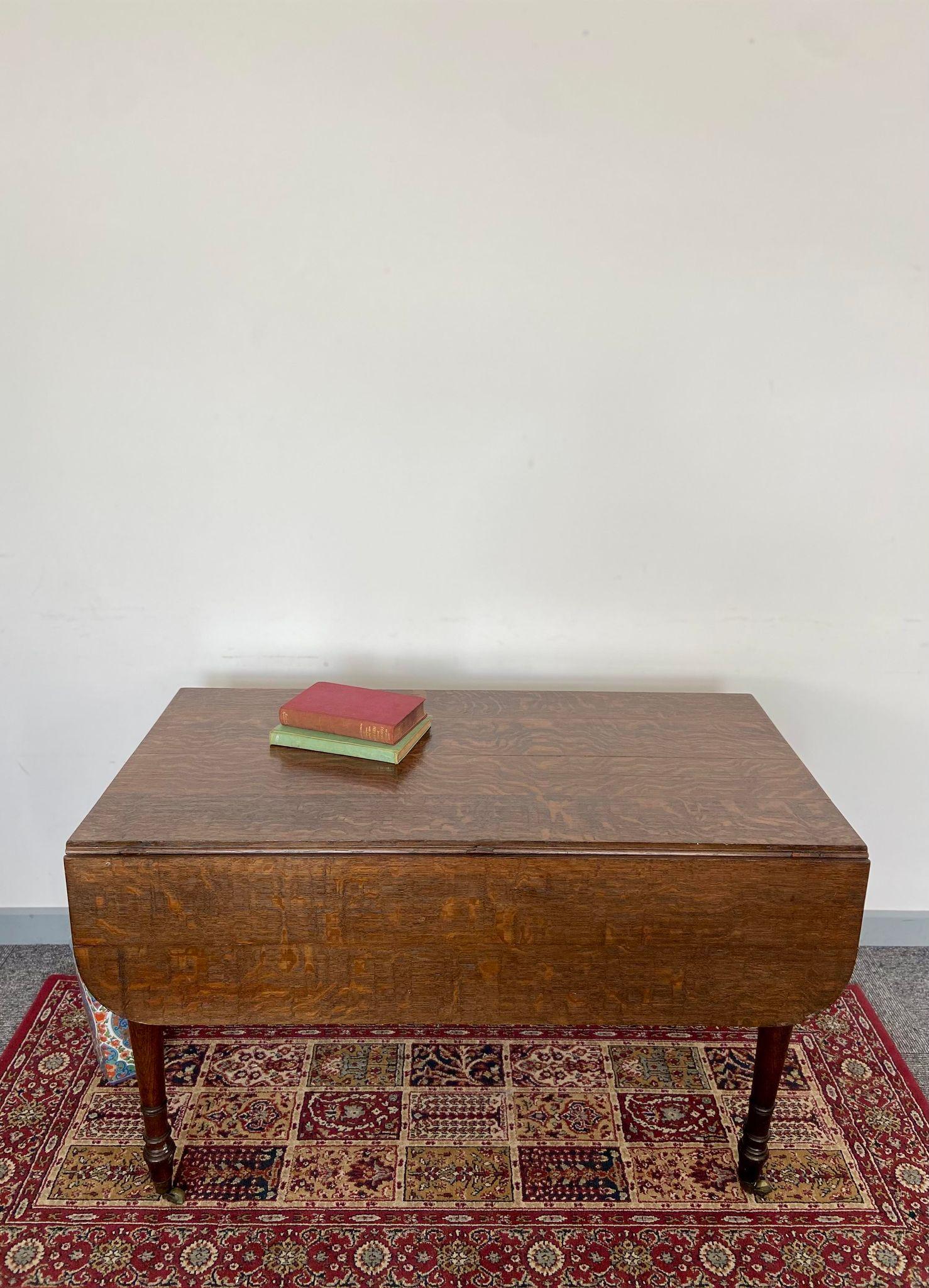 Antique Victorian Drop Leaf Pembroke Table / Turned Legs & Castor / Tiger Oak Wood - Made in England c.1850