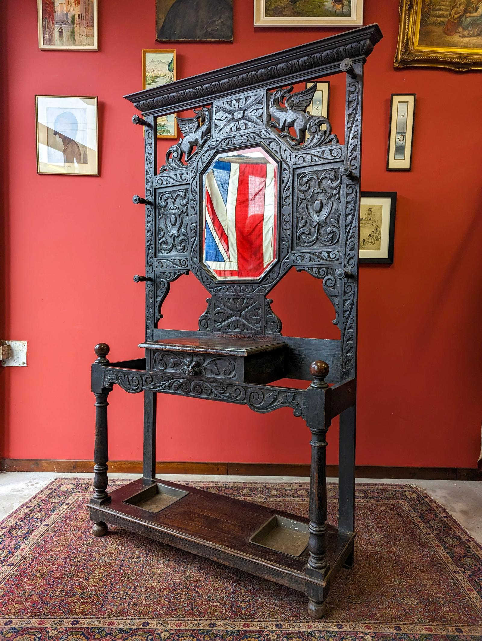Antique Victorian Ebonised Carved Mahogany Welsh Hall Stand