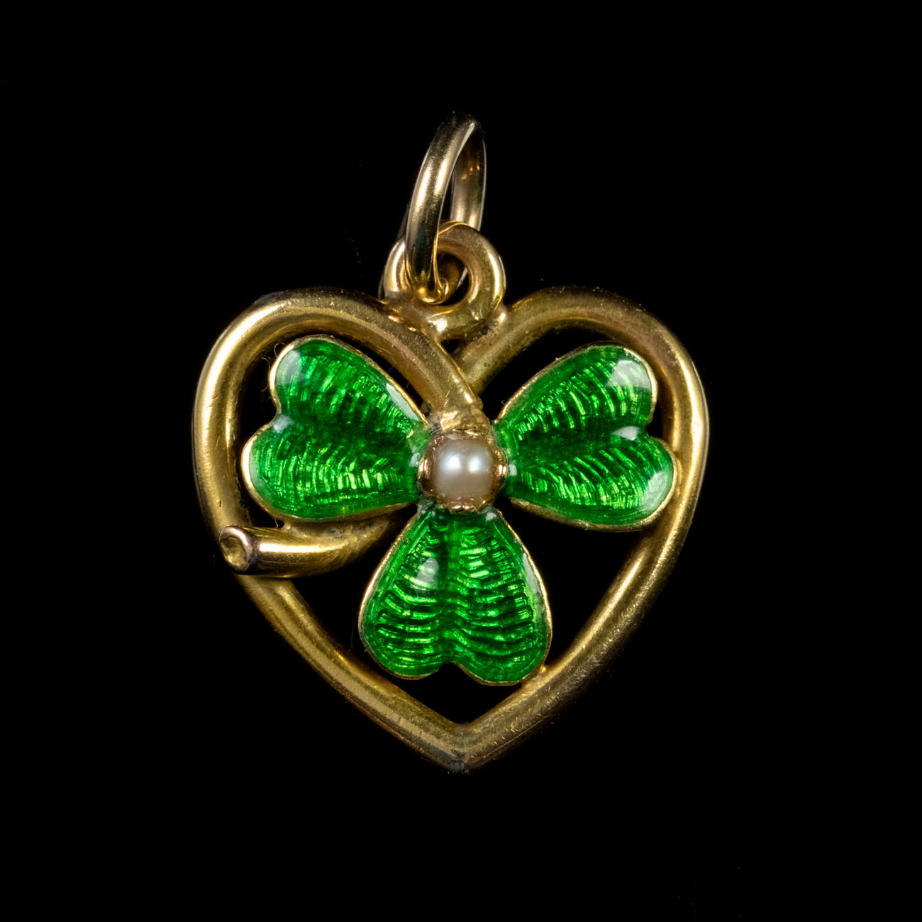 Antique Victorian Enamel Shamrock Heart Pendant 18ct Gold c.1860