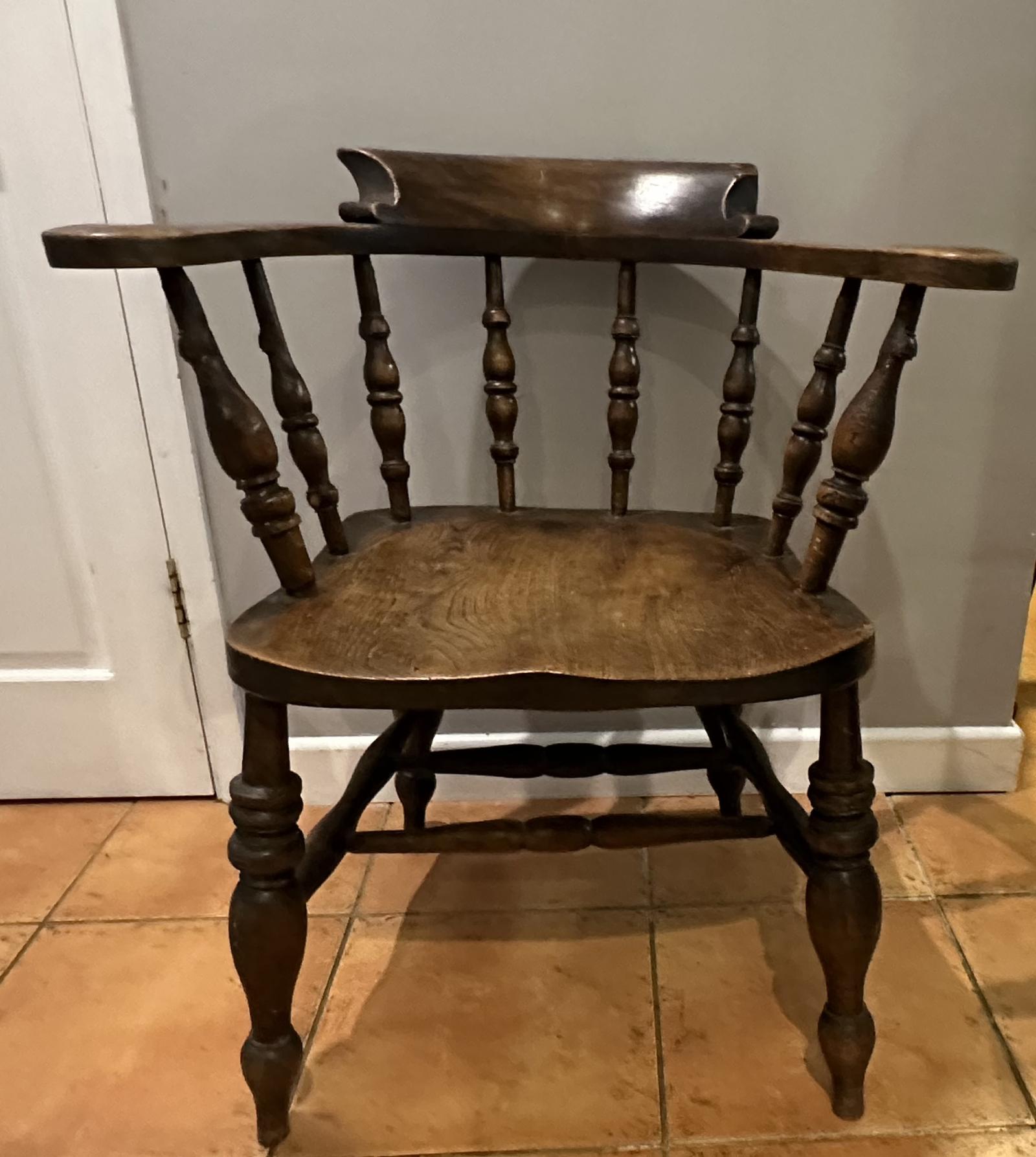 Antique Victorian English Elm Bow Smokers Chair Captains Chair