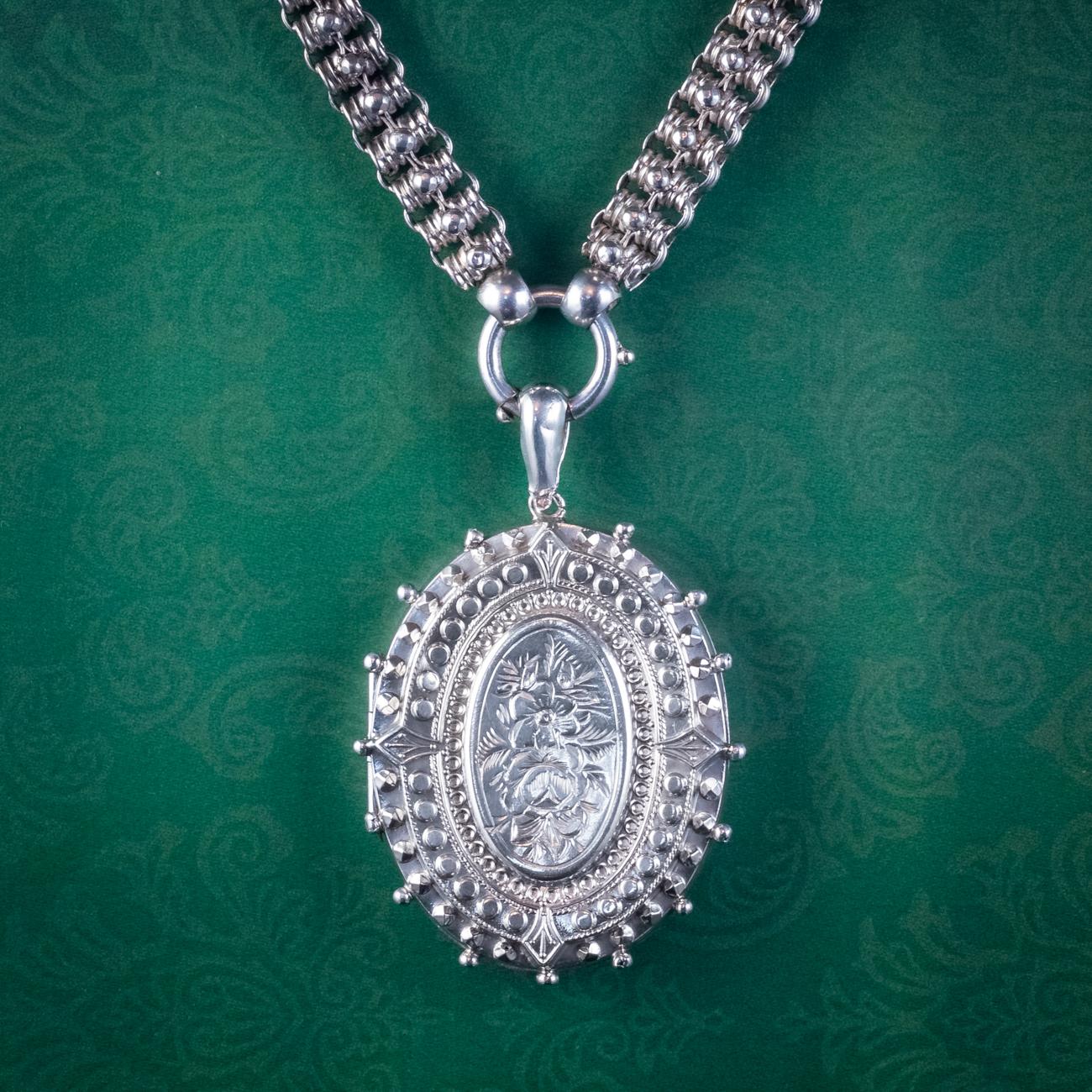 Antique Victorian Forget Me Not Locket Collar Necklace Sterling Silver Dated 1882