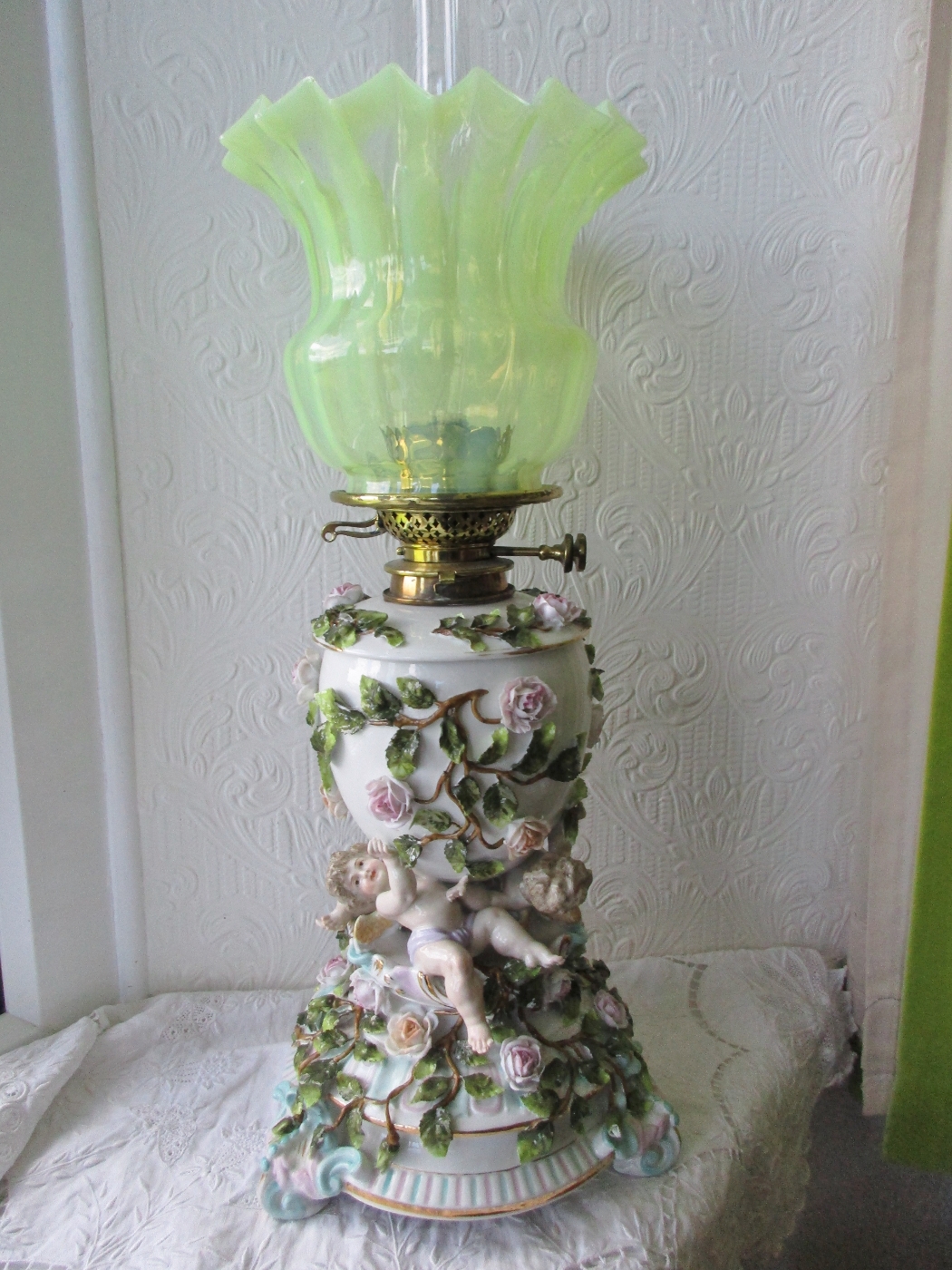 Antique Victorian German "Sitzendorf" Porcelain Cherubs Oil Lamp c.1895