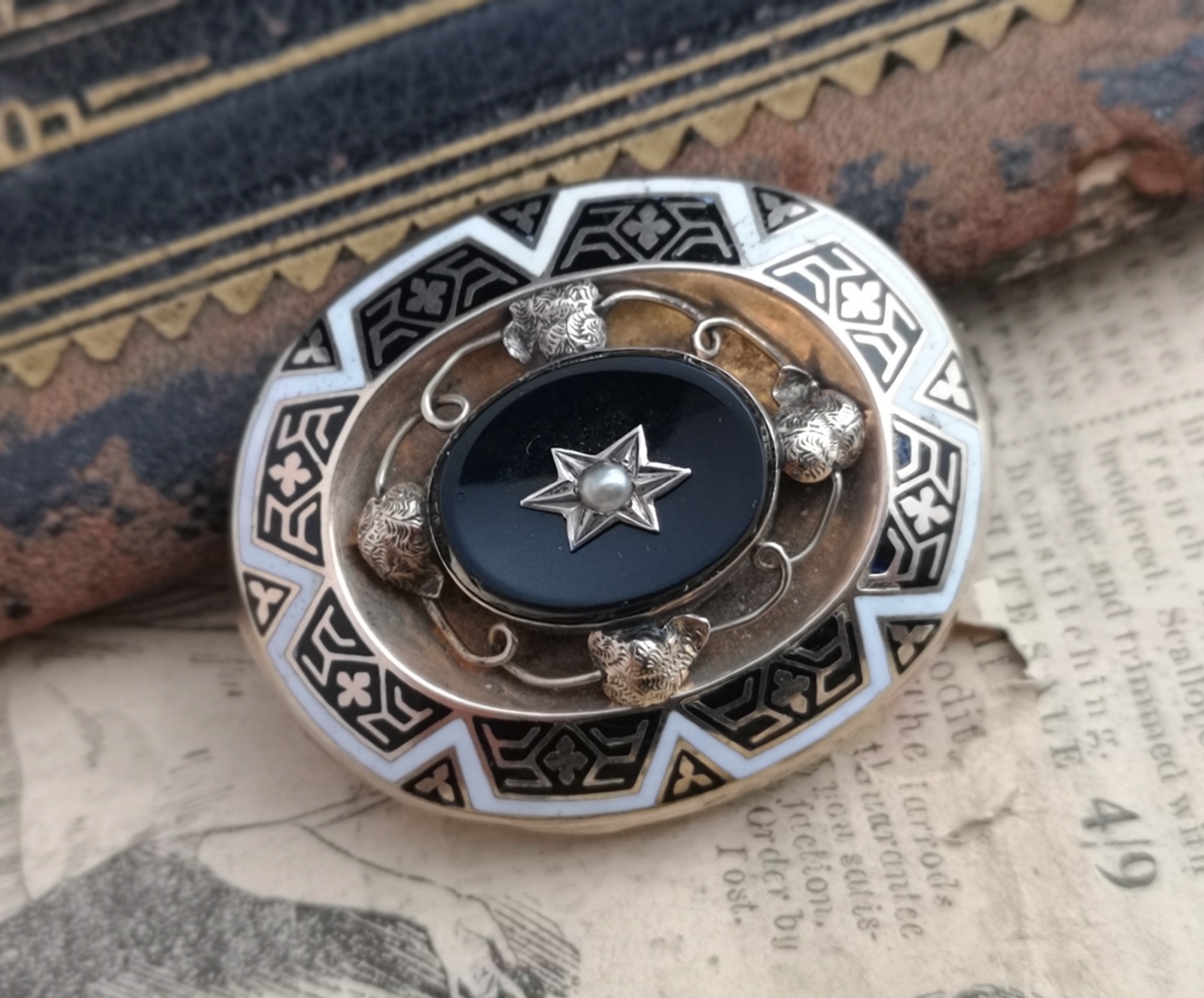 Antique Victorian Gold & Enamel Mourning Brooch, Onyx & Pearl