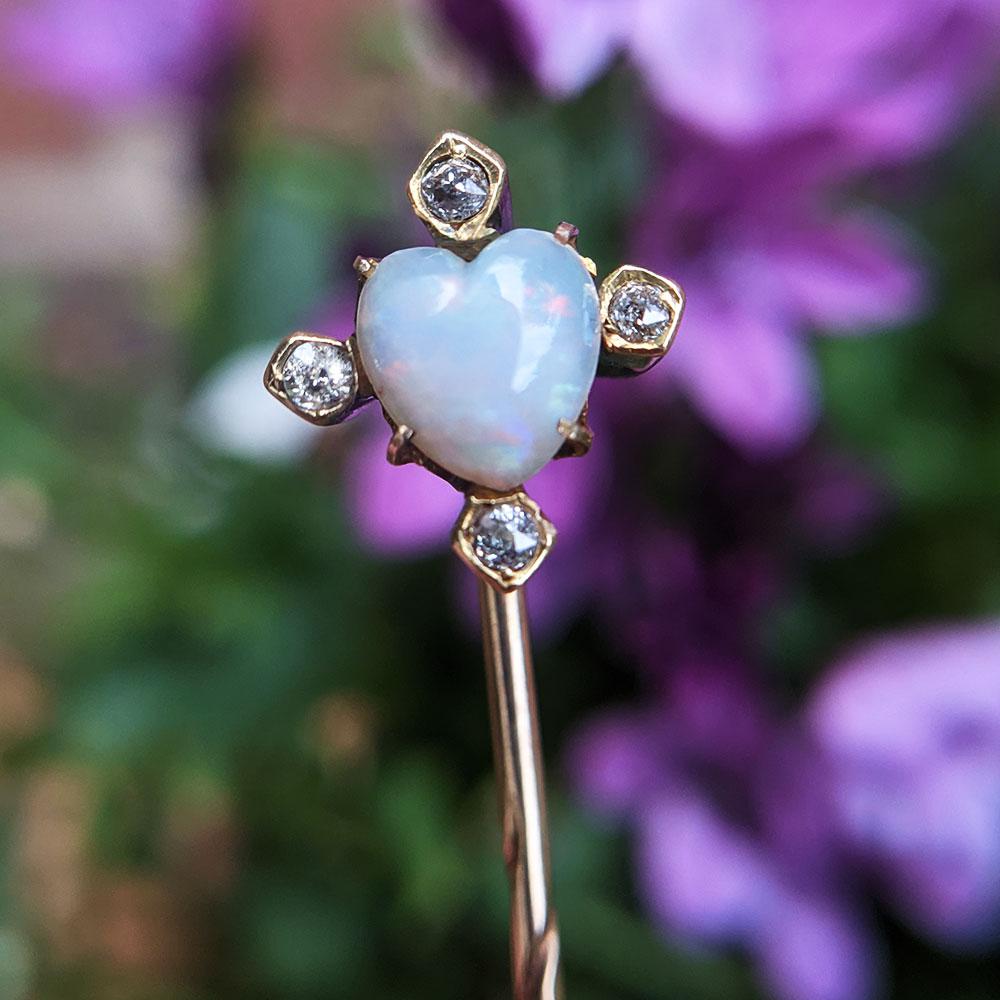 Antique Victorian Gold Opal Heart & Diamond Cased Stick Pin