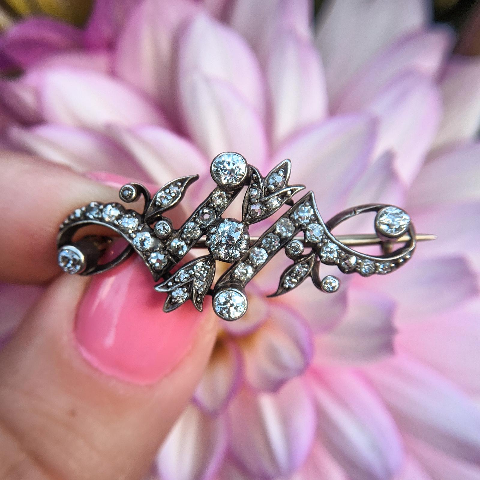 Antique Victorian Gold & Silver Diamond Tulip Scrollwork Brooch
