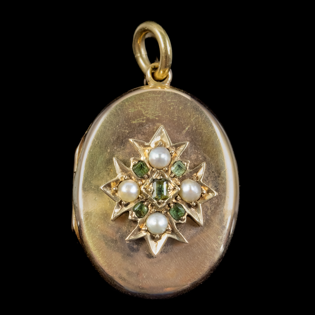 Antique Victorian Green Garnet Pearl Cross Locket 18ct Gold c.1890