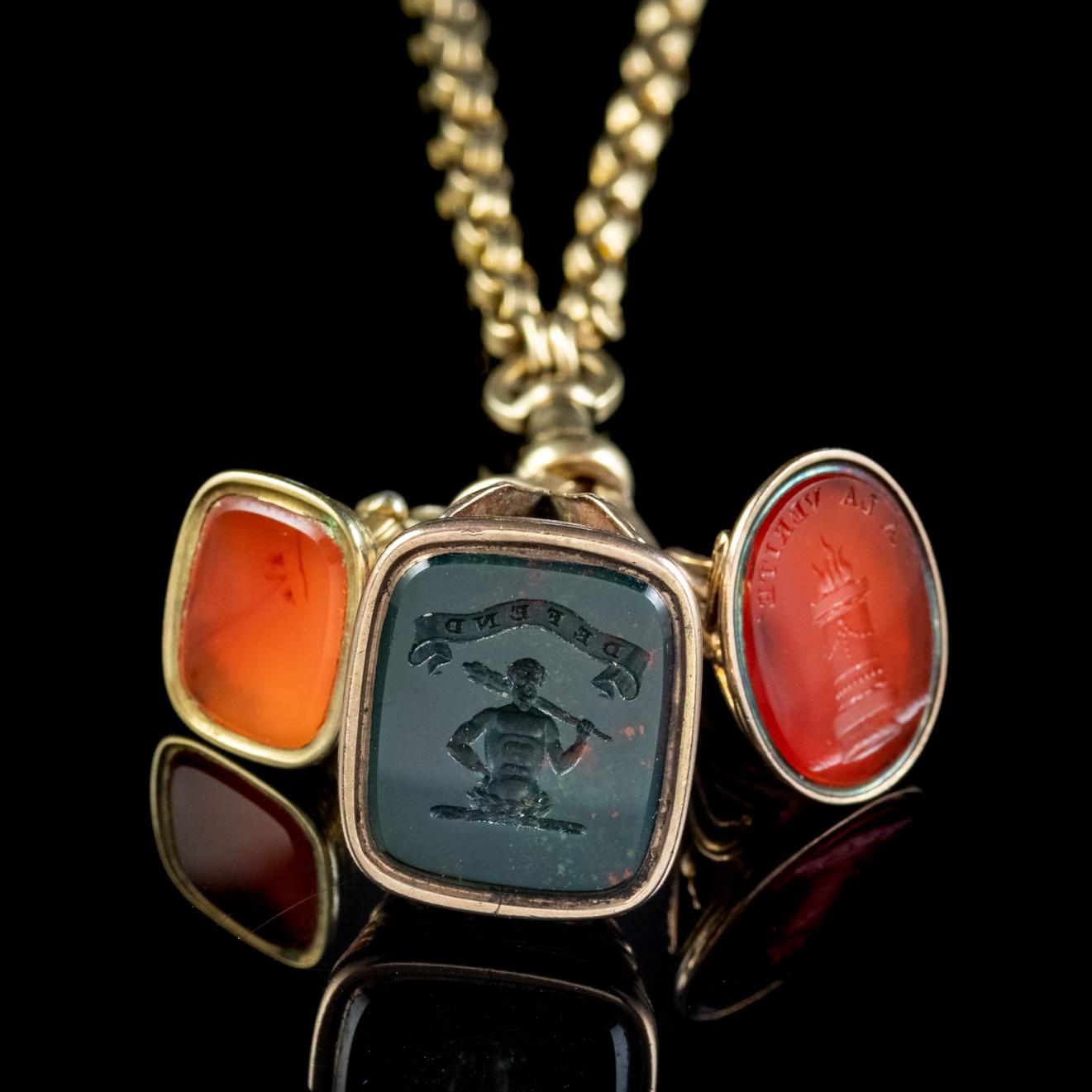 Antique Victorian Guard Chain 9ct Gold Circa 1880 With Three Georgian Seal Fobs