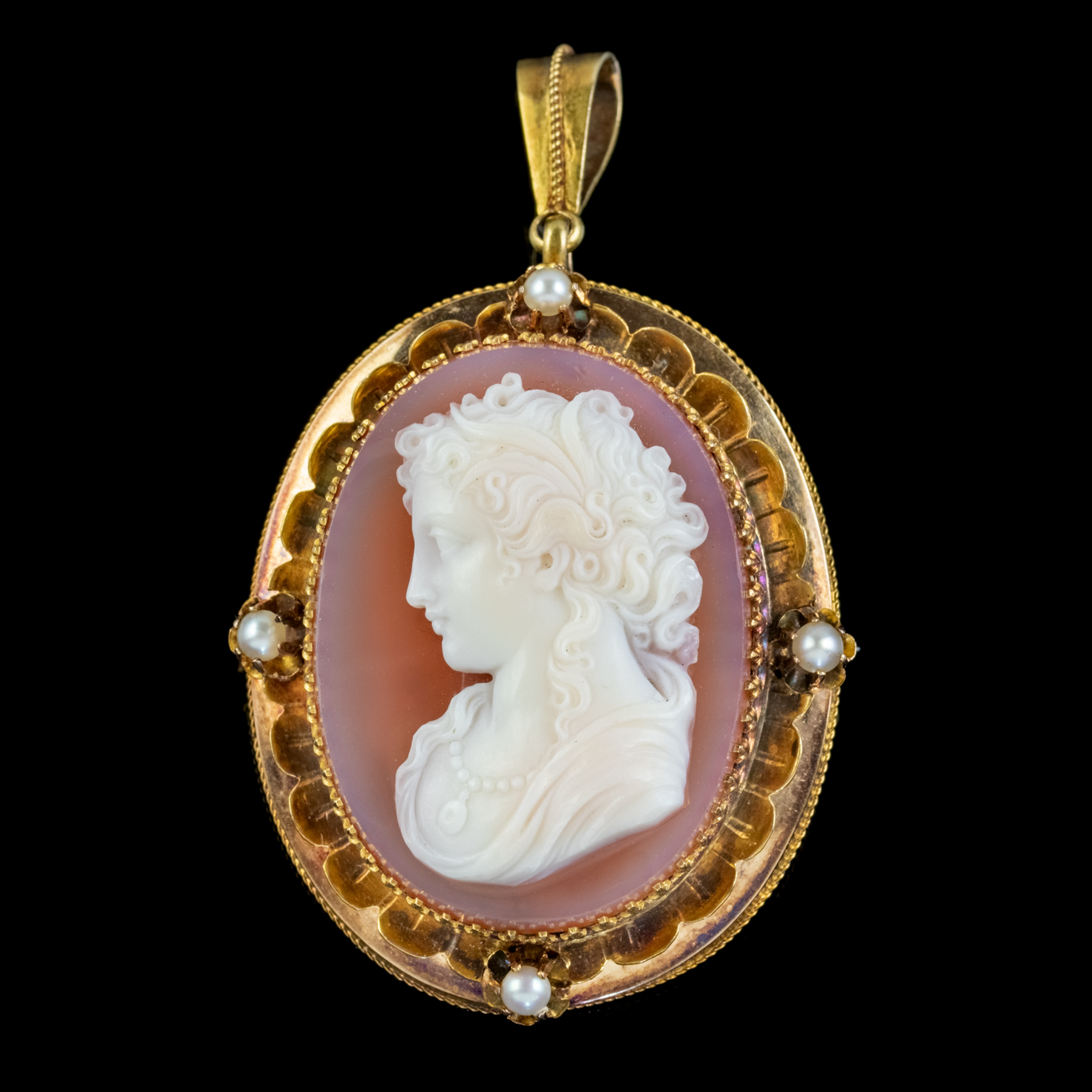 Antique Victorian Hardstone Cameo Pearl Brooch Pendant 18ct Gold c.1860