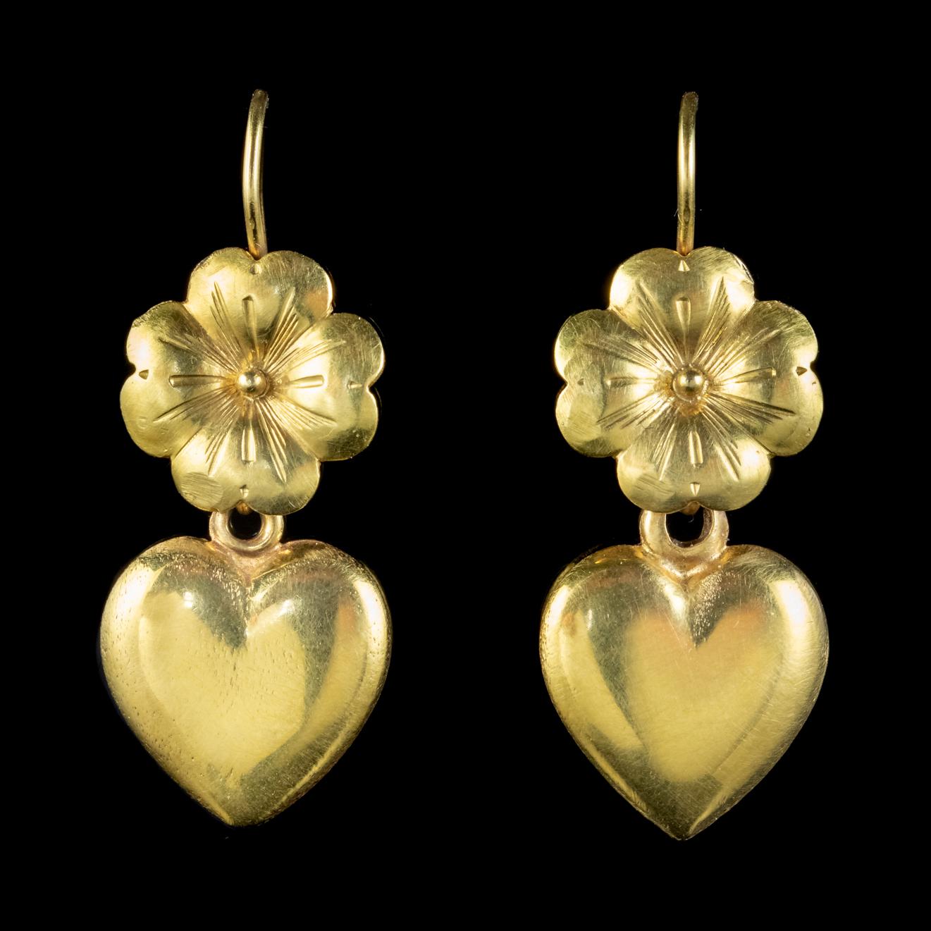 Antique Victorian Heart Four Leaf Clover Earrings 18ct Gold Circa 1860